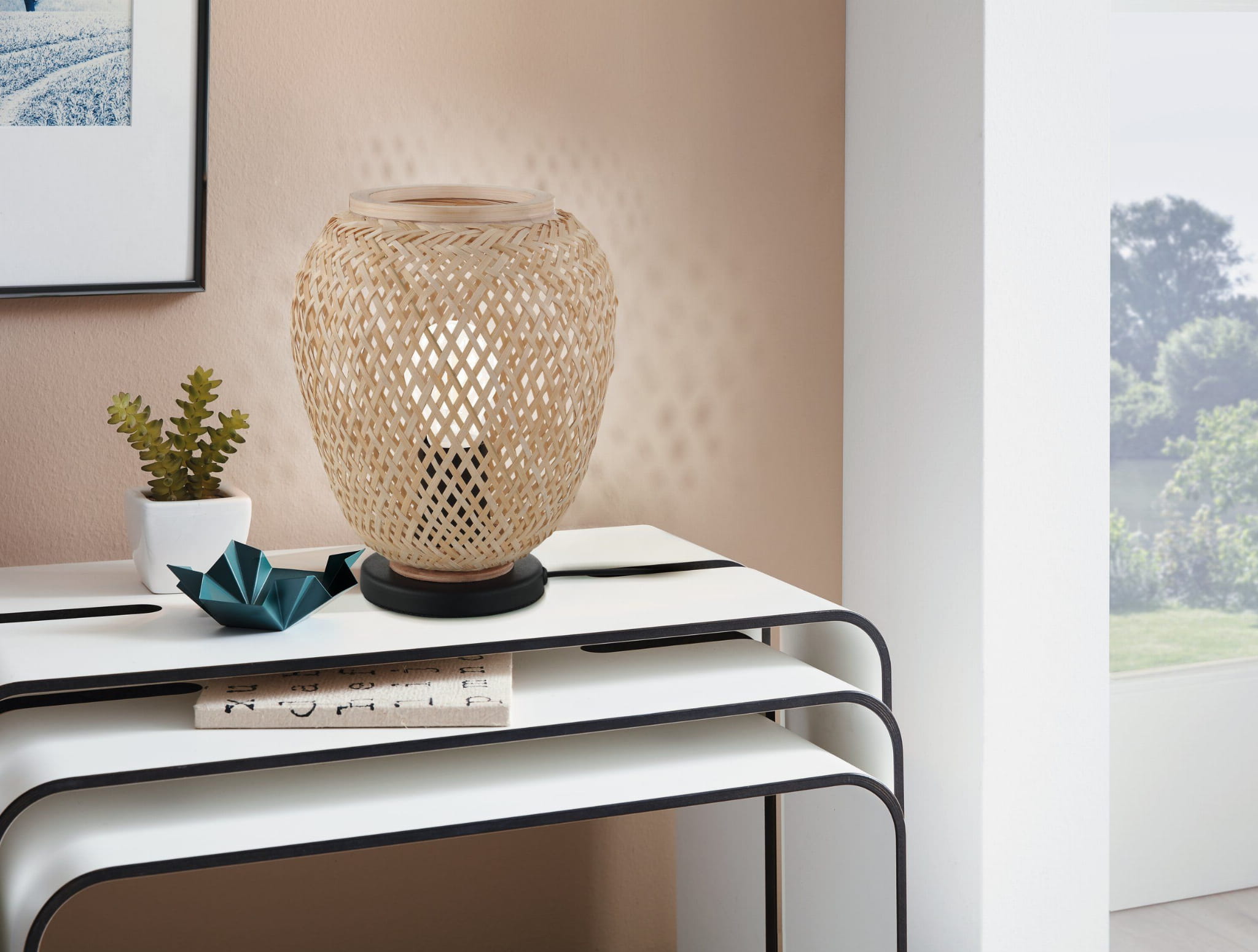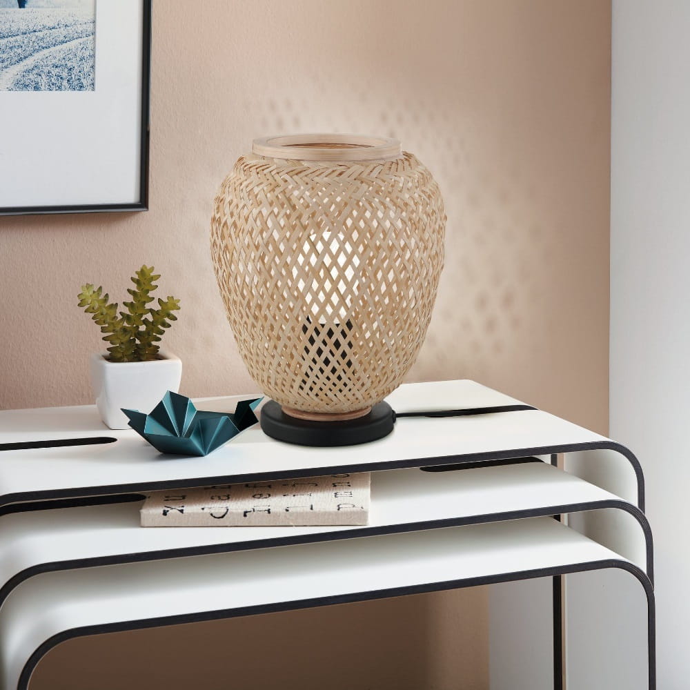 Lampa stołowa DEMBLEBY to propozycja dla miłośników stylu boho i naturalnych materiałów. Jej konstrukcja bazuje na drewnianej podstawie o lekkim, ażurowym charakterze, która przyciąga uwagę geometryczną formą i ciepłym odcieniem drewna. Czarna oprawka E27 osadzona centralnie pozwala na wyeksponowanie dekoracyjnej żarówki, czyniąc światło głównym elementem kompozycji. To doskonały dodatek do salonu, jadalni lub przedpokoju, który wprowadza przytulność i oryginalny klimat inspirowany naturą.