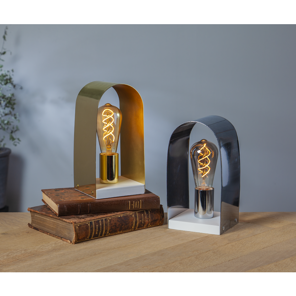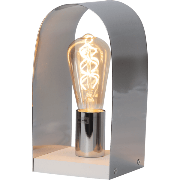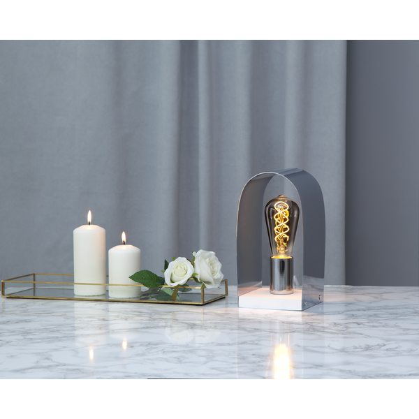 Chromowana lampa stołowa NOBEL to elegancki, nowoczesny akcent, który doda blasku każdemu wnętrzu. Jej minimalistyczna, metalowa konstrukcja bez klosza idealnie eksponuje dekoracyjną żarówkę, tworząc efektowne i stylowe oświetlenie. Dzięki lśniącemu, chromowanemu wykończeniu lampa doskonale wpisuje się zarówno w nowoczesne, jak i industrialne aranżacje. To subtelny dodatek do salonu, sypialni czy gabinetu, który podkreśli charakter pomieszczenia i stworzy wyjątkową atmosferę.