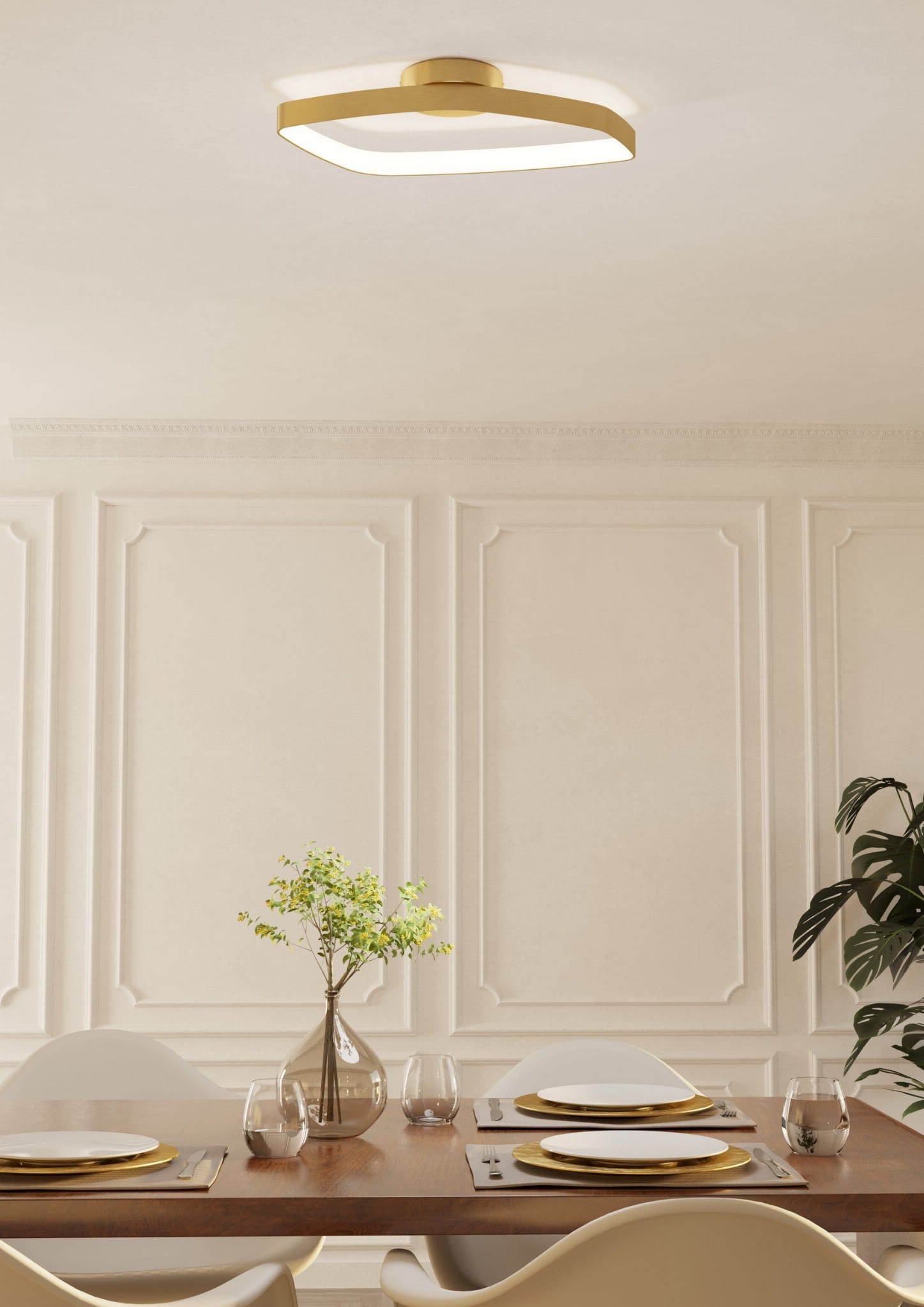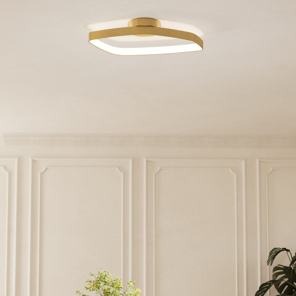 VALLEROSA to nowoczesna lampa sufitowa o eleganckim wykończeniu w kolorze szczotkowanego mosiądzu. Jej minimalistyczna forma i zintegrowane światło LED tworzą efektowną całość do stylowych wnętrz.