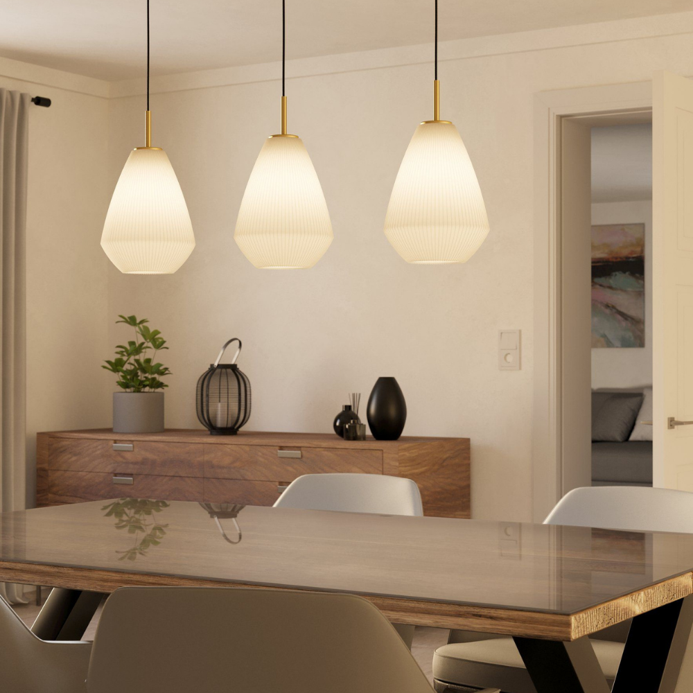 Wyważona forma Zawieszona nad stołem lub wyspą kuchenną, tworzy subtelną i spójną kompozycję świetlną.