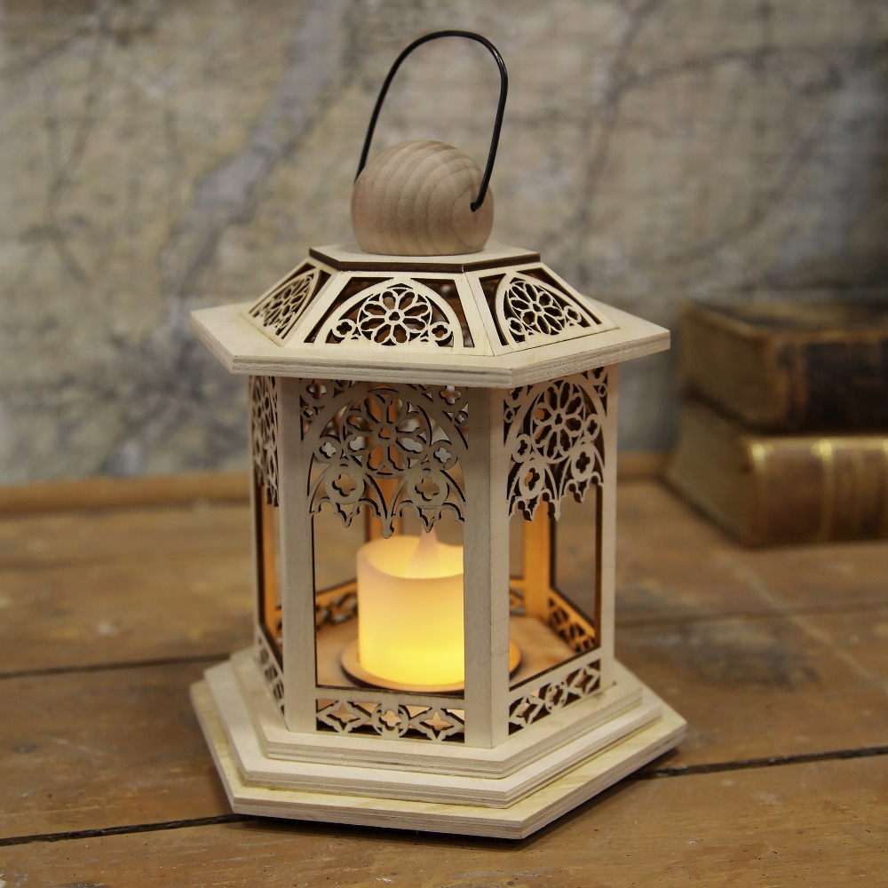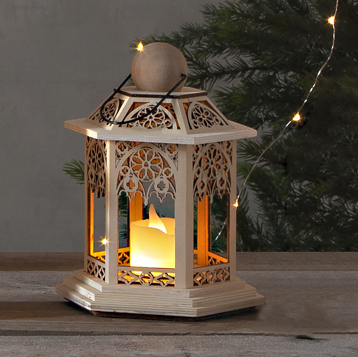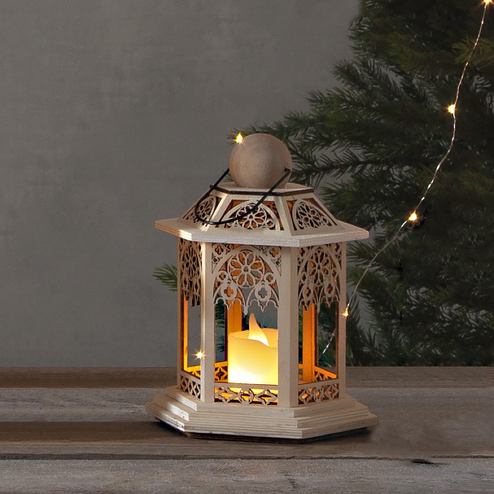 Eleganckie wzornictwo – ażurowe detale i drewniana konstrukcja nadają lampionowi charakteru i stylu.