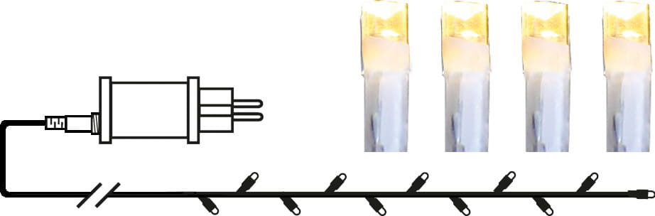 Schemat techniczny – lampki choinkowe LED 180 pkt na kablu transparentnym o odstępie 7 cm, ciepła biała barwa 3000 K, zasilanie sieciowe, zastosowanie wewnętrzne i zewnętrzne.
