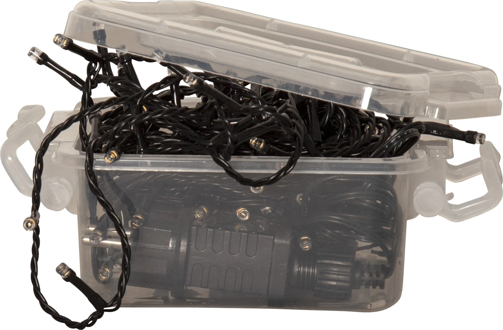 Praktyczny pojemnik w zestawie – trwałe i poręczne pudełko z zamknięciem ułatwia przechowywanie lampek po sezonie.