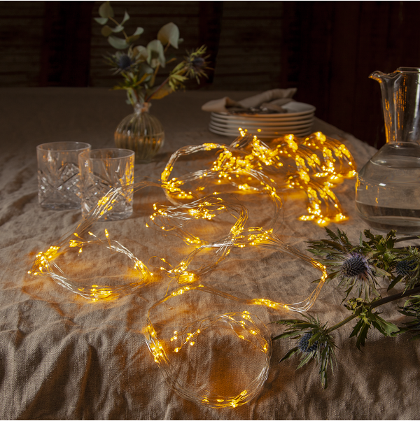 Srebrne druciki z mikro diodami LED tworzą efektowną iluminację, która pięknie rozświetla wnętrze i dodaje mu elegancji. Zasilanie sieciowe zapewnia stabilne działanie oraz wygodę użytkowania – bez potrzeby wymiany baterii.