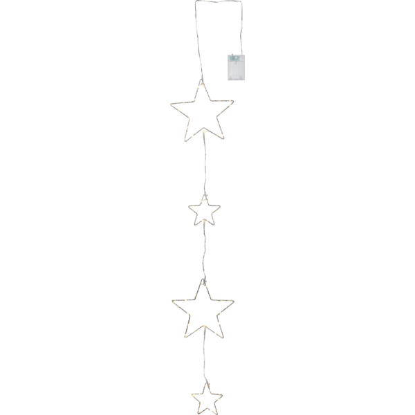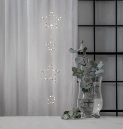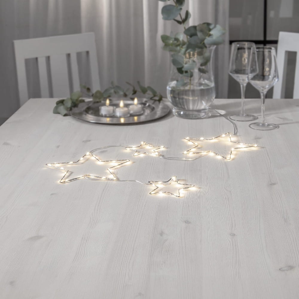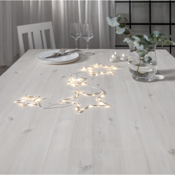 Elegancki design i wszechstronne zastosowanie - łańcuch świetlny składa się z metalowych gwiazd w dwóch rozmiarach: większe o średnicy 20 cm oraz mniejsze o średnicy 10 cm. Ozdobiony łącznie 60 ciepłymi białymi diodami LED, które delikatnie rozświetlają wnętrze, wprowadzając przytulny nastrój.