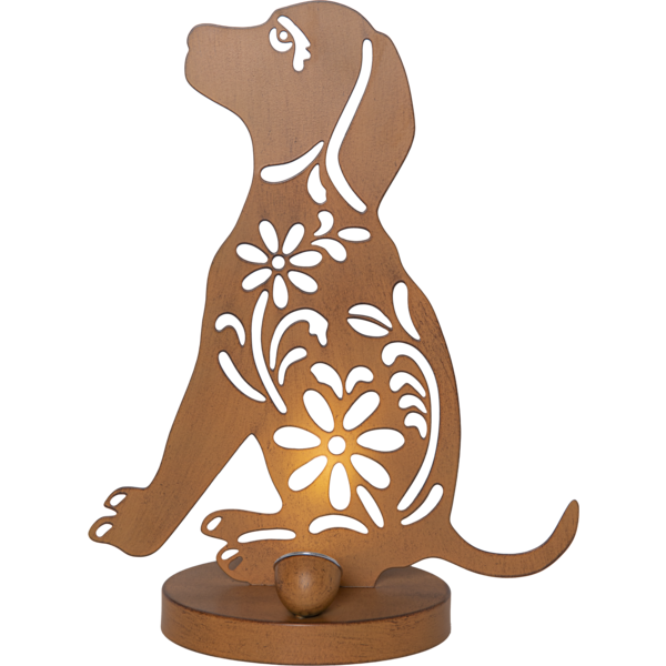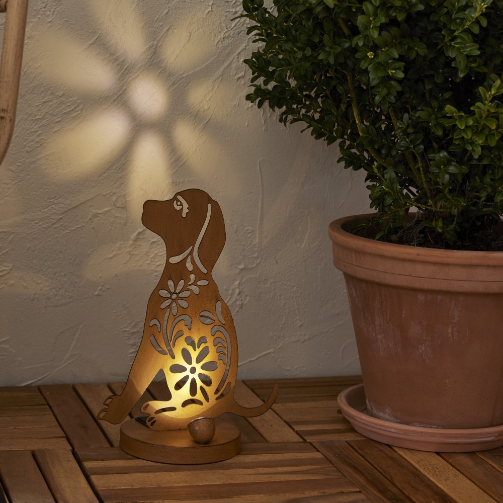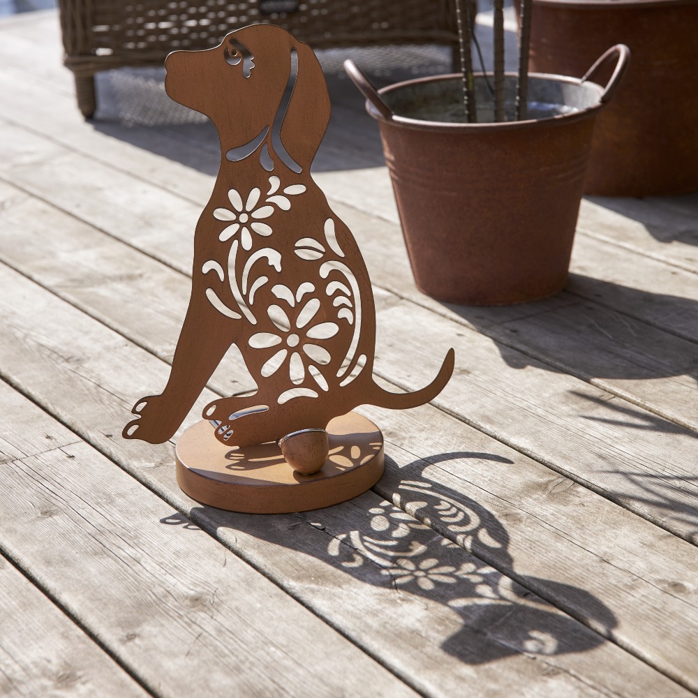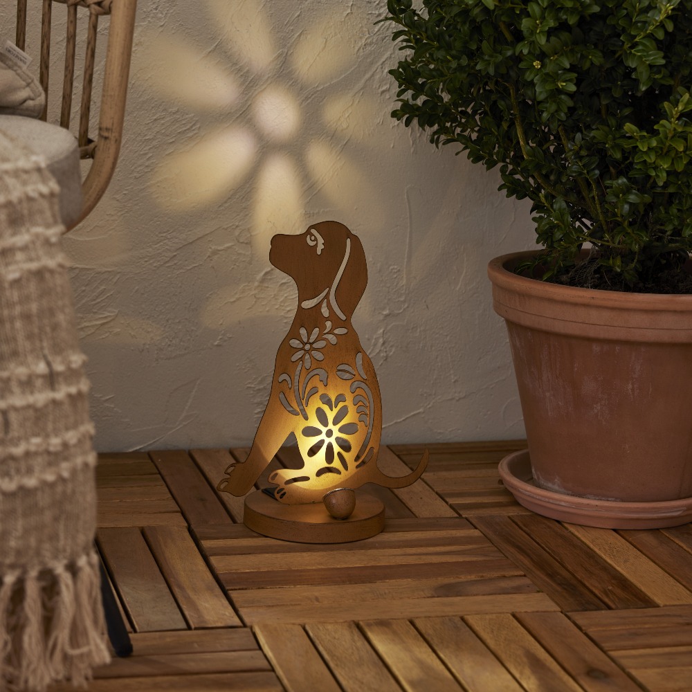 Stylowa dekoracja do ogrodu i na balkon – lampka doskonale sprawdzi się jako ozdoba schodów, kwietników, tarasu lub balkonu. Dekoracyjna sylwetka psa w kolorze rdzy przyciąga wzrok zarówno w dzień, jak i wieczorem, tworząc przytulny klimat w otoczeniu roślin.