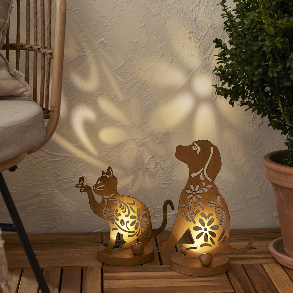 Dodaj do swojej przestrzeni ogrodowej wyjątkowy dekoracyjny akcent dzięki solarnej lampie LED w kształcie psa. Ozdobna sylwetka z ażurowymi motywami kwiatowymi oraz wykończenie w modnym kolorze rdzy sprawiają, że dekoracja pięknie prezentuje się zarówno w ciągu dnia, jak i po zmroku. Ciepłe światło LED wydobywające się z wnętrza lampy tworzy przytulną atmosferę i podkreśla dekoracyjne wzory.