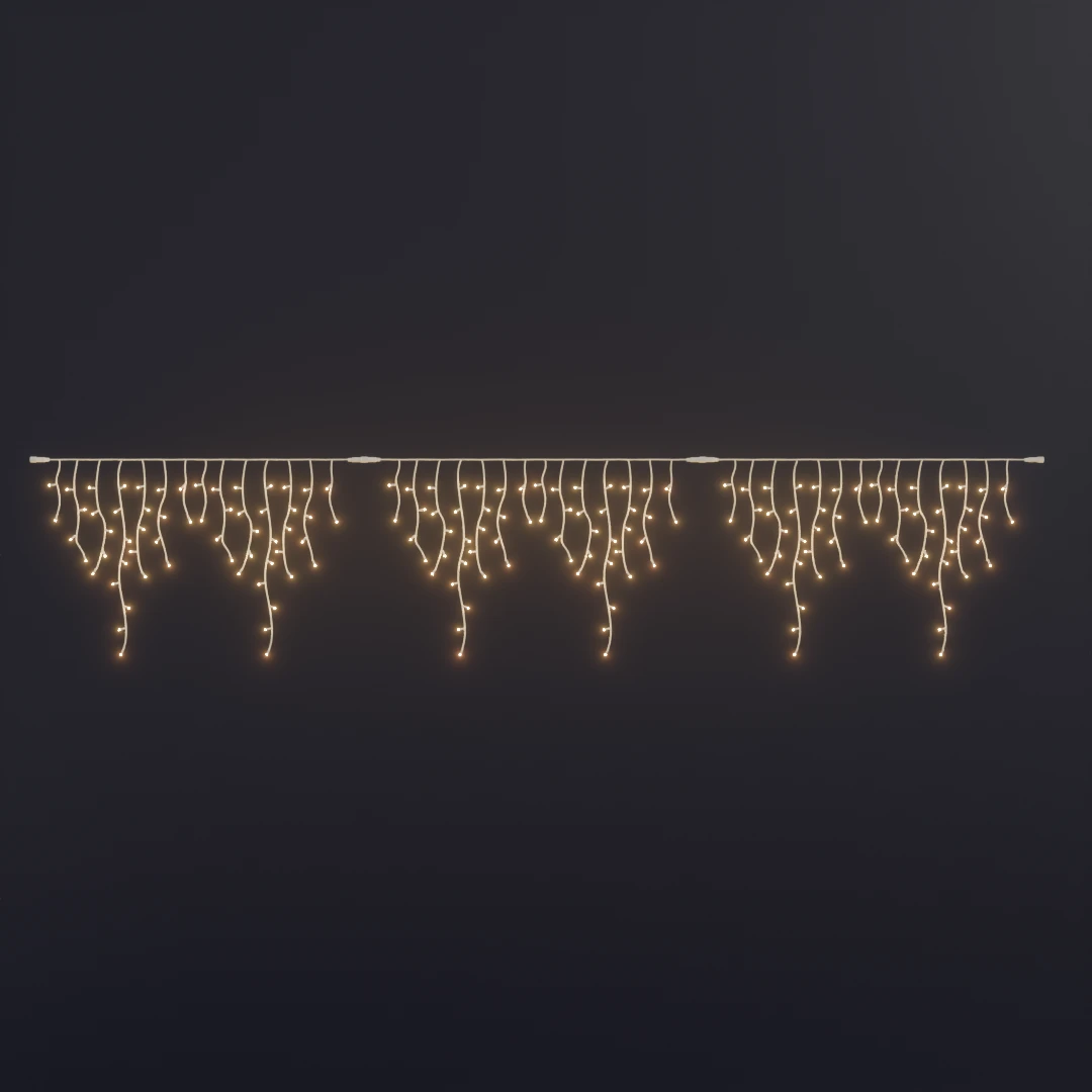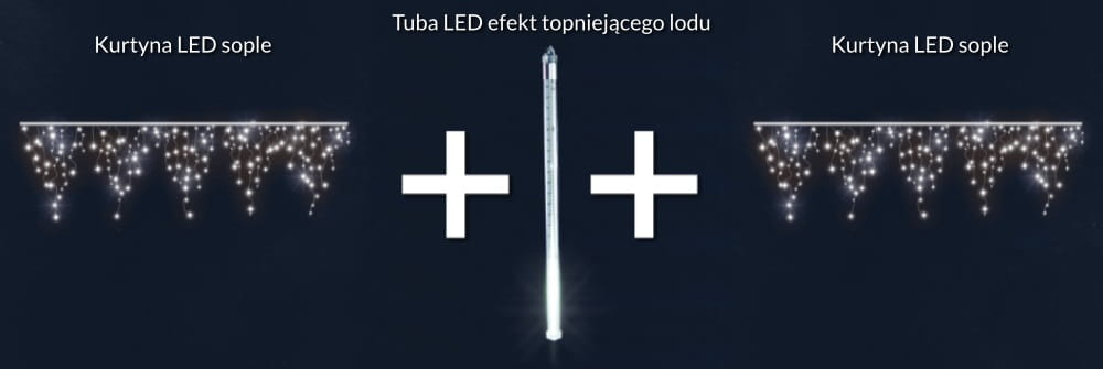 Ten model kurtyny SOPLE jest najczęściej stosowanym modelem w dużych, profesjonalnych projektach iluminacji świątecznych w Polsce. Duża gęstość rozmieszczenia diod LED oraz charakterystycznie układające się sznury o zwisie do 90 cm dają niesamowicie efektowną dekorację na elewacjach.