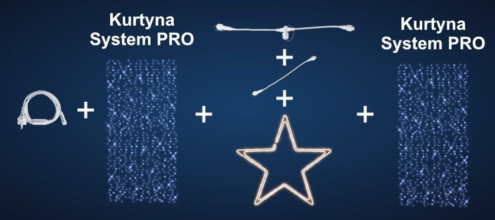 Kurtyny SYSTEM PRO IP65 można połączyć z Tubami LED. Tuby wpina się w linie łączeń szeregowych kurtyn. Można podłączyć dwa rodzaje Tub bezpośrednio do kutyn lub przy wykorzystaniu trójników i przedłużaczy systemowych.
