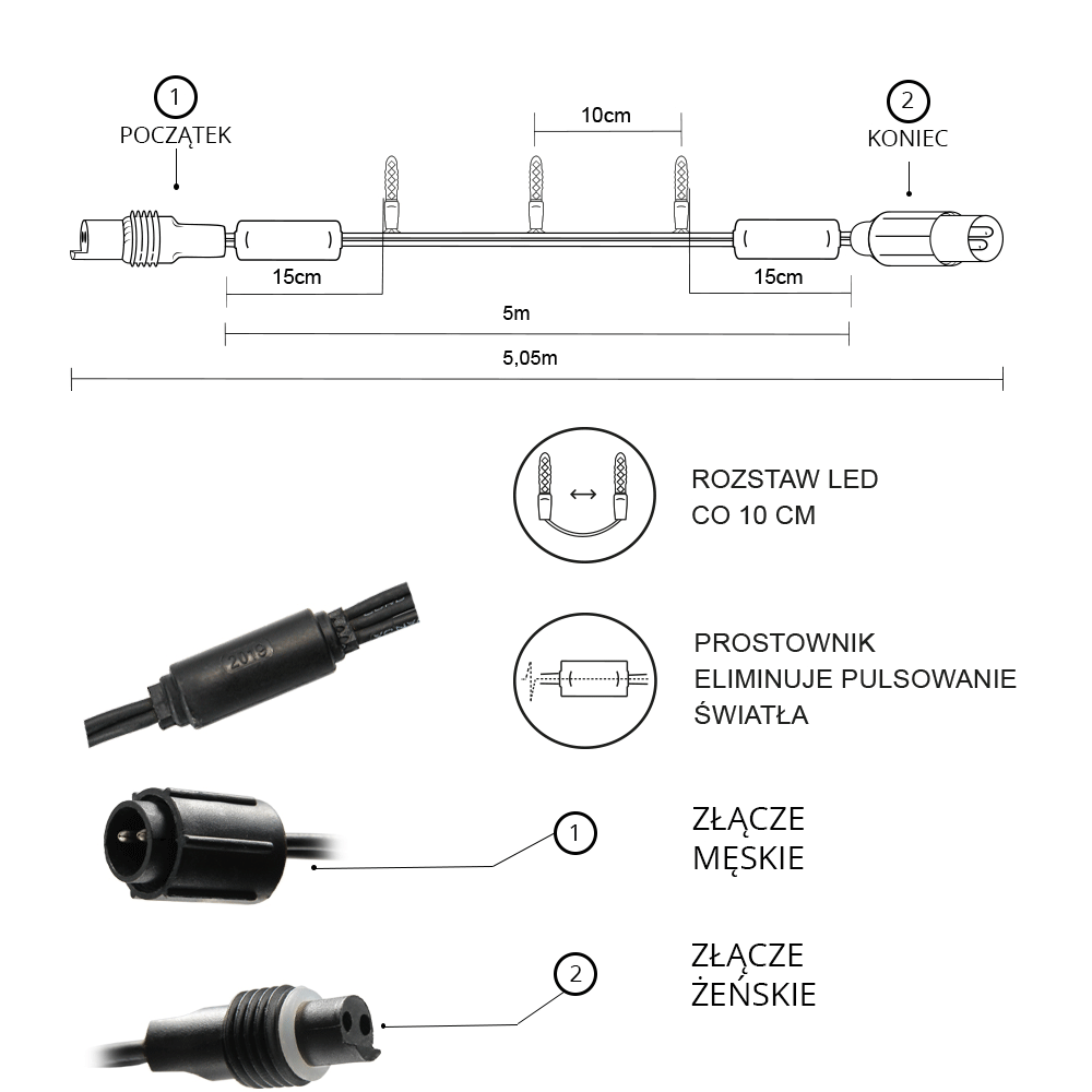 Każdy z kompletów to 5 metrowy przewód zawierający 50 diod LED, rozstawionych w odległości co 10 cm. Dodatkowo każdy zakończony jest specjalną końcówką, za pomocą której można szybko i sprawnie podłączyć ze sobą do 80 zestawów na jednym kablu zasilającym.