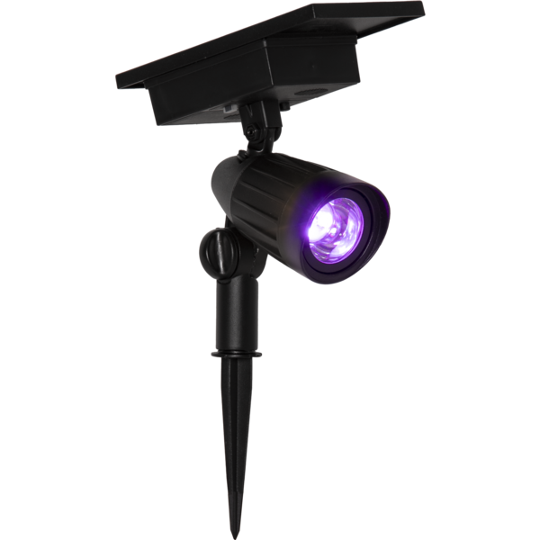 Reflektor solarny LED emitujący fioletowe światło, podkreślający rośliny dekoracyjne w ogrodzie po zmroku.