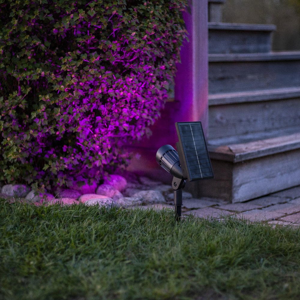 Reflektor solarny LED emitujący ciepłe białe światło, przeznaczony do punktowego oświetlenia roślin po zmroku.