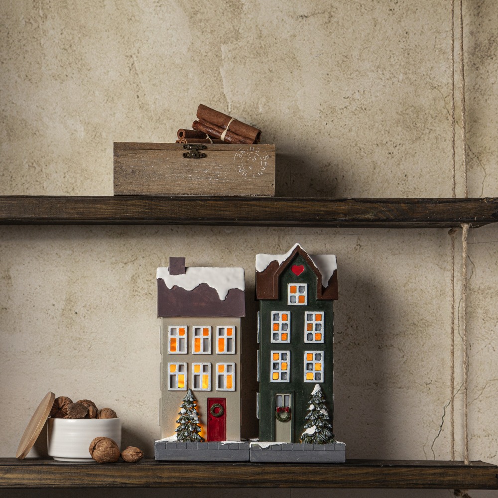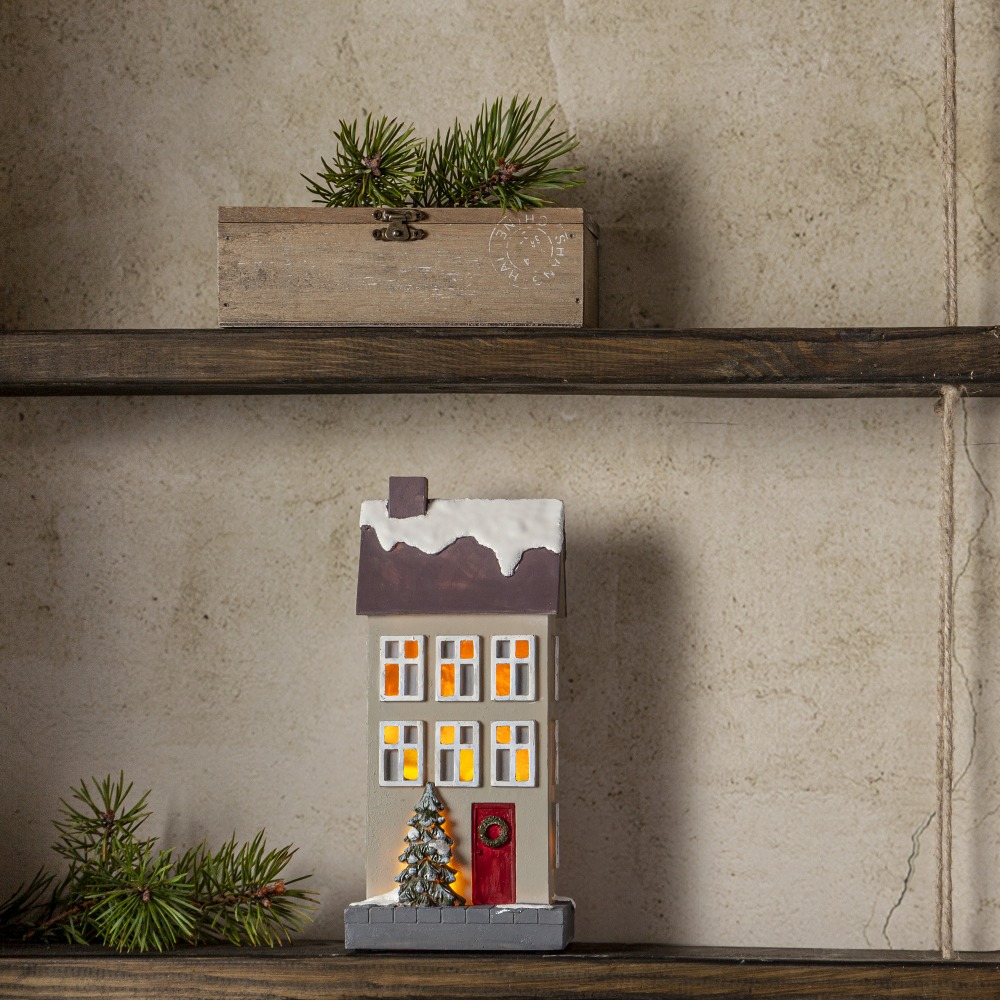Piękna dekoracja w formie beżowego domku z czerwonymi drzwiami i świątecznym wieńcem tworzy ciepły, zimowy akcent. Podświetlone okna emanują przytulnym blaskiem, a u wejścia stoi ośnieżona choinka, która dopełnia uroku tej uroczej scenki. Całość została wykonana z dbałością o detale i będzie świetnym elementem świątecznego wystroju.