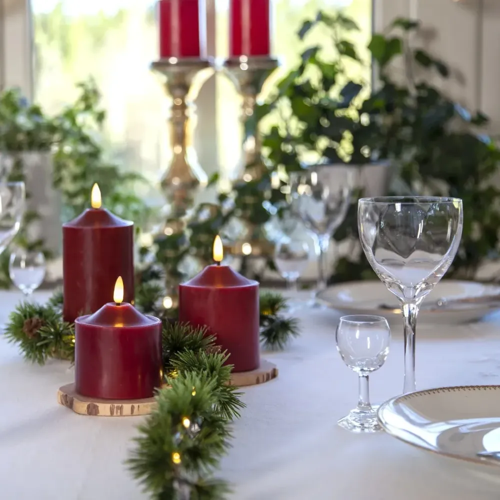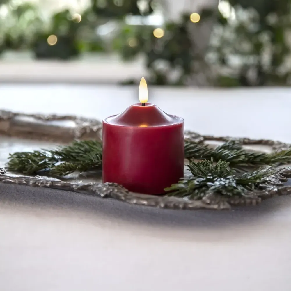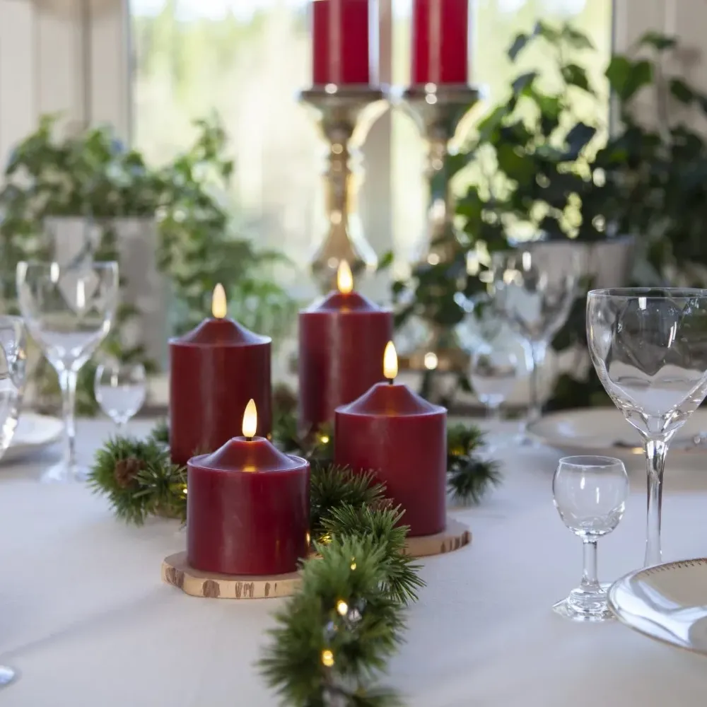 Flamme Top to wyjątkowa świeca LED wykonana z prawdziwego wosku w eleganckim, głębokim czerwonym kolorze. Jej zaokrąglona góra i subtelnie migoczący, ciepły płomień realistycznie imitują światło tradycyjnej świecy, tworząc przytulną atmosferę. To doskonały wybór do świątecznych dekoracji, romantycznych wieczorów czy eleganckich aranżacji wnętrz. Idealna jako dekoracja stołu, kominka czy świątecznych aranżacji, zarówno solo, jak i w zestawieniu z innymi świecami z serii Flamme.
