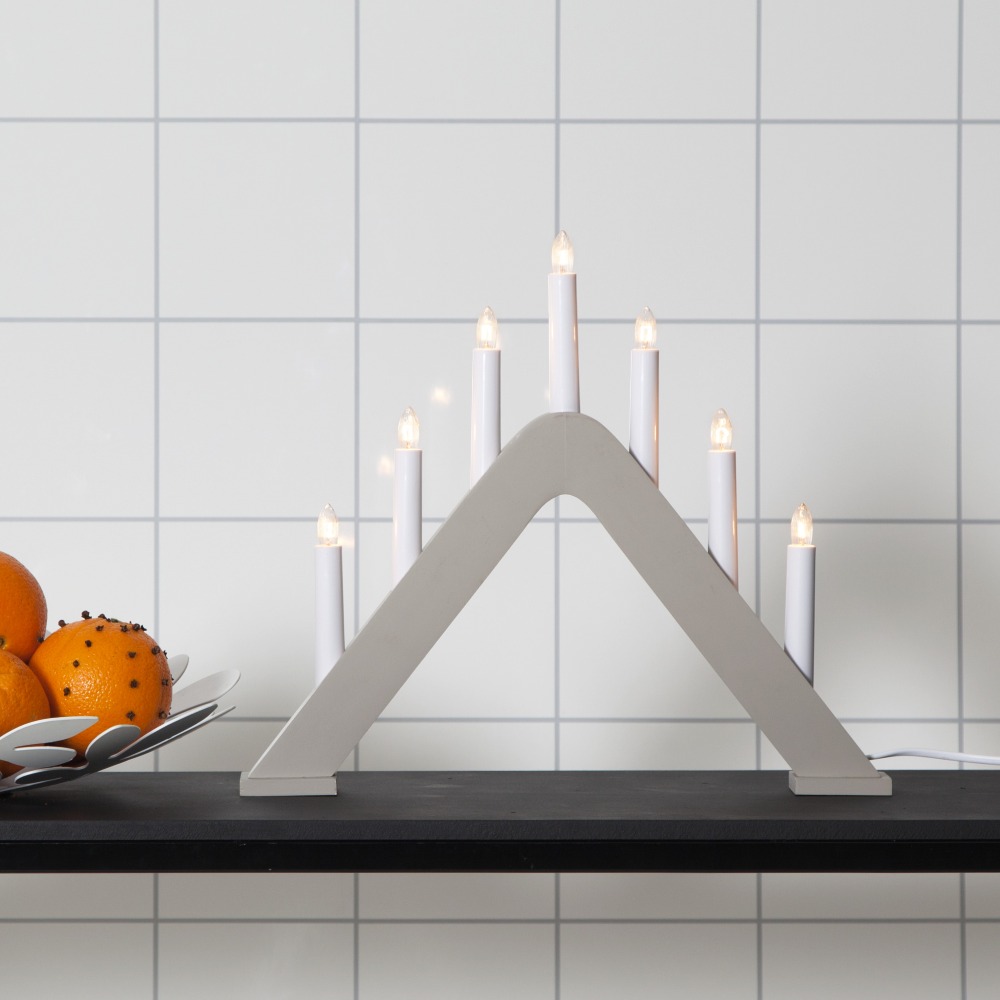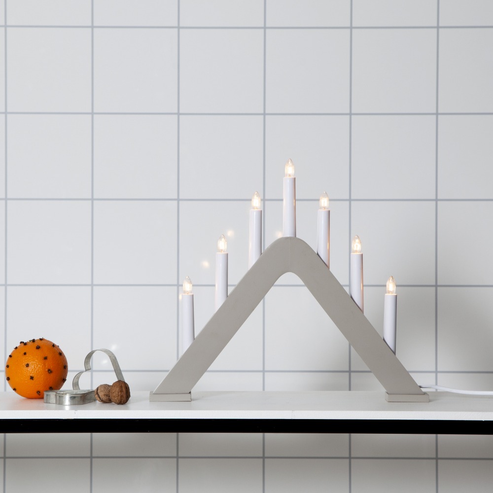 Beżowy drewniany świecznik to delikatna i ponadczasowa dekoracja, która wnosi do wnętrza spokój, harmonię i naturalny urok. Jasna, neutralna kolorystyka pięknie współgra ze światłem świec, tworząc stonowaną, przyjemną atmosferę. Klasyczna forma z siedmioma świecami doskonale komponuje się zarówno z tradycyjnymi, jak i nowoczesnymi aranżacjami. Świecznik zasilany jest z sieci 230V, posiada przełącznik na kablu oraz wymienne żarówki typu E10.