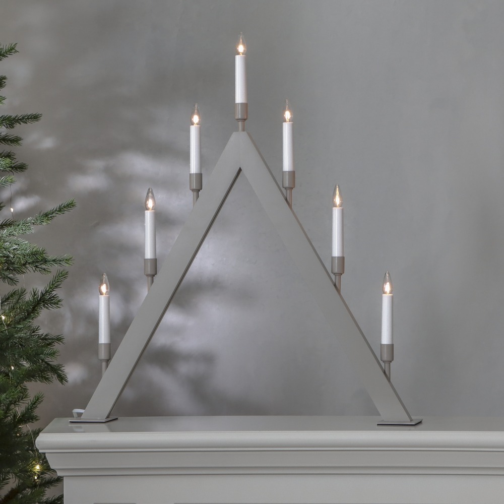 Beżowy świecznik o geometrycznej formie to dekoracja, która wnosi do wnętrza spokój, naturalność i świąteczne ciepło. Siedem smukłych świec ustawionych w kształcie trójkąta tworzy zrównoważoną, lekką kompozycję. Jasny, neutralny odcień beżu doskonale wpisuje się zarówno w klasyczne, jak i nowoczesne aranżacje, budując przytulny nastrój. Dekoracja zasilana jest z sieci 230V i wyposażona w wymienne żarówki typu E10.