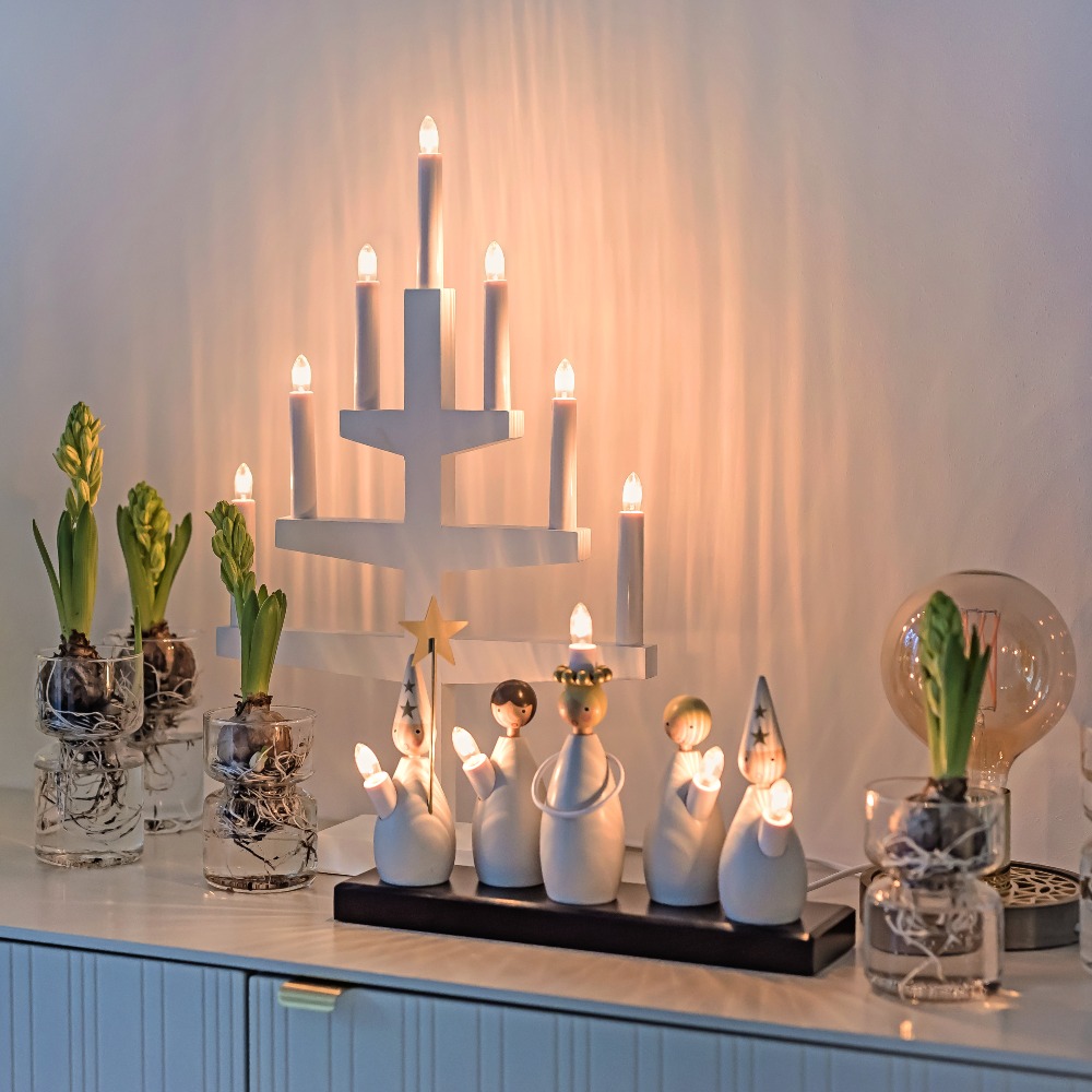 Trwałość i praktyczność – świecznik zasilany sieciowo 230V i wyposażony w wymienne żarówki E10, zapewnia wygodę użytkowania przez wiele sezonów.