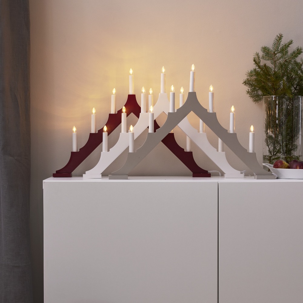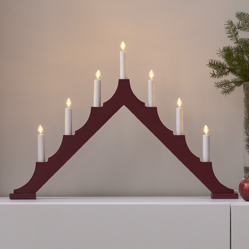 Czerwony drewniany świecznik to klasyczna dekoracja, która wprowadza do wnętrza ciepło i wyjątkowy świąteczny nastrój. Głęboki, bordowy odcień pięknie kontrastuje z jasnymi świeczkami, tworząc elegancki akcent w oknie, na stole lub komodzie. Siedem świeczek emituje przyjemne światło, które buduje atmosferę świątecznych spotkań. Drewno z certyfikatem FSC® podkreśla ekologiczny charakter dekoracji.