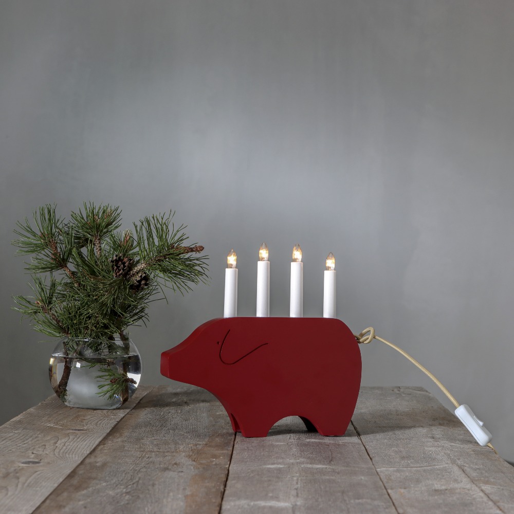 Czerwony świecznik w kształcie świątecznej świnki to dekoracja, która wnosi do wnętrza ciepło i radosny charakter świąt. Cztery świeczki umieszczone na jej grzbiecie roztaczają delikatne światło, tworząc przytulną atmosferę sprzyjającą rodzinnym chwilom i zimowym wieczorom. To ozdoba, która łączy w sobie urok tradycyjnych dekoracji z elegancją świątecznej aranżacji. Świecznik zasilany jest z sieci 230V, posiada przełącznik na kablu oraz możliwość wymiany żarówek typu E10.