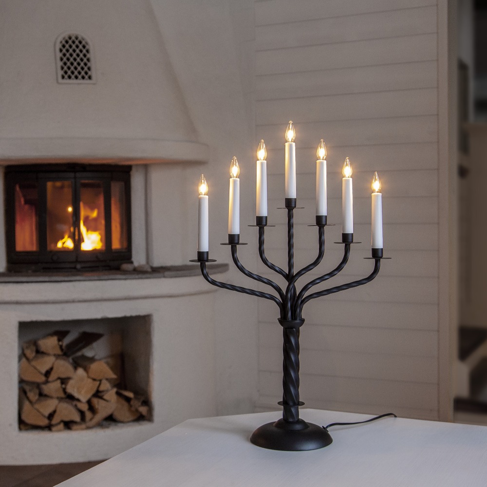 Stylowy świecznik w kolorze czarnym zachwyca klasyczną formą i solidnym, metalowym wykonaniem. Siedem ramion tworzy harmonijną kompozycję, którą dopełniają wymienne żarówki E10, umożliwiające łatwe dopasowanie oświetlenia do nastroju wnętrza. Stabilna podstawa gwarantuje bezpieczne ustawienie, a całość doskonale sprawdzi się zarówno w salonie, jak i w jadalni czy na komodzie w przedpokoju. Zasilanie 230V zapewnia niezawodność i wygodę codziennego użytkowania.
