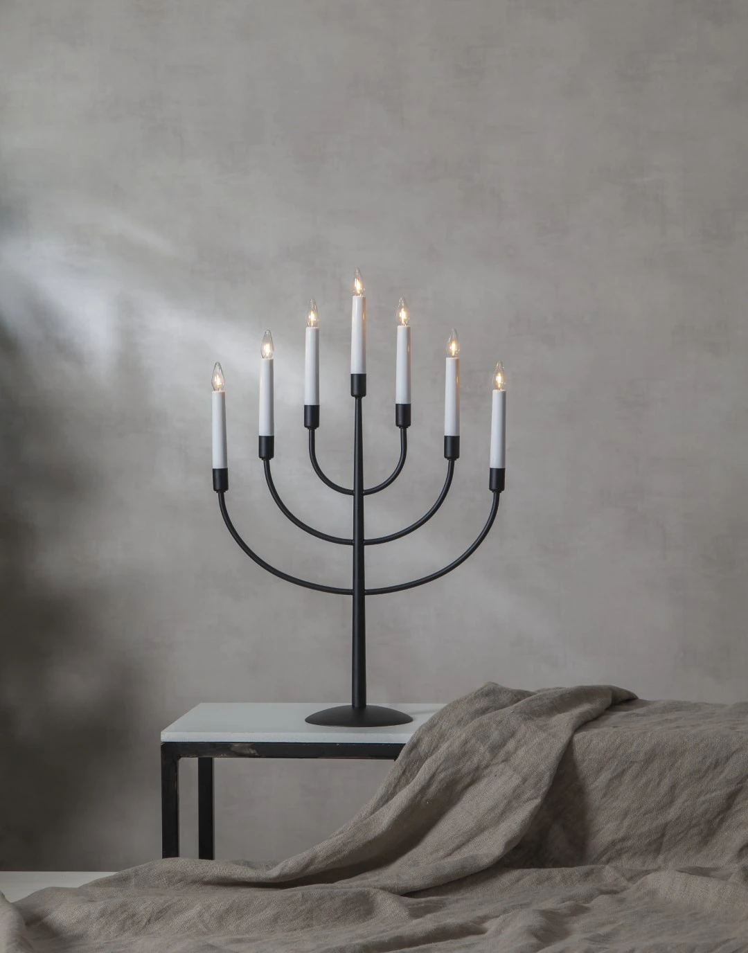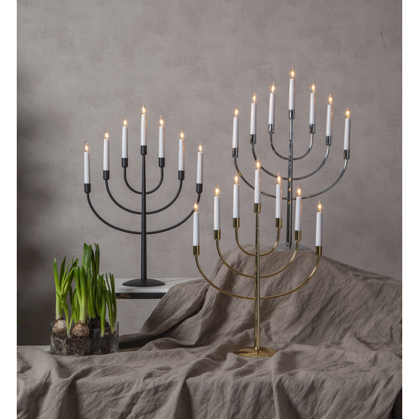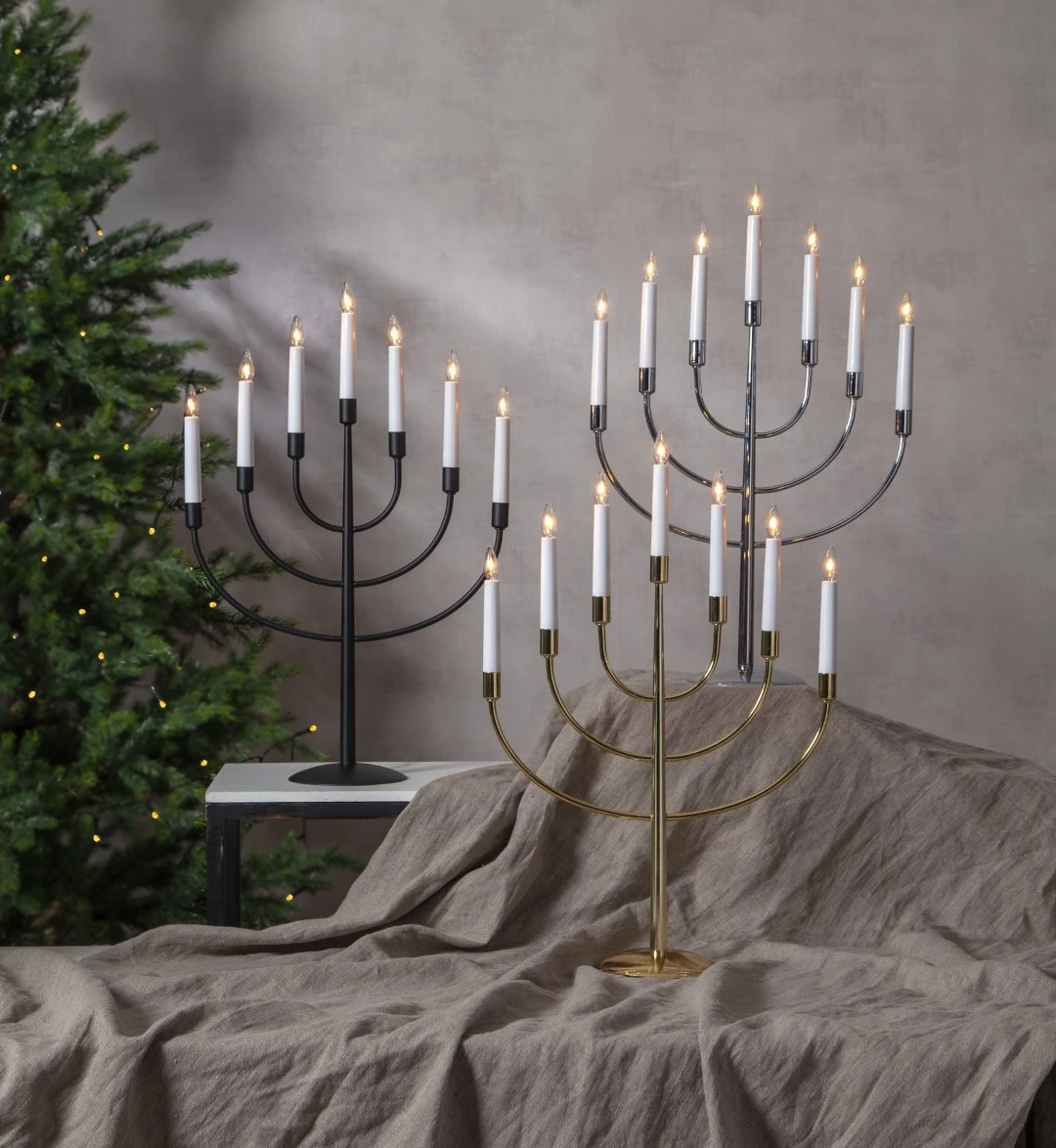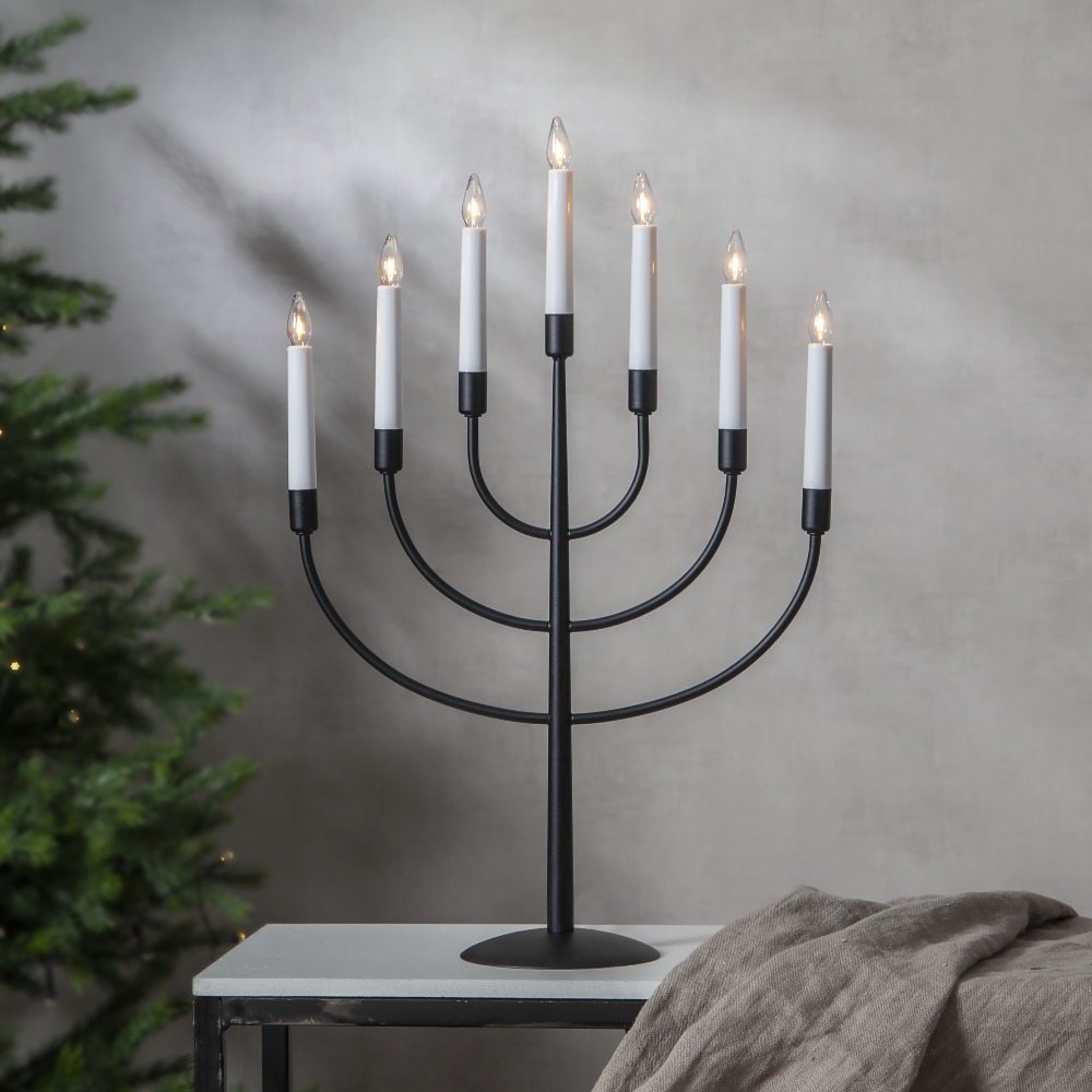 Świecznik w kolorze czarnym wyróżnia się prostotą i nowoczesną elegancją. Siedem ramion, ułożonych w klasyczną formę, tworzy wyważoną i efektowną kompozycję, która doskonale pasuje do minimalistycznych oraz współczesnych aranżacji. Źródła światła z wymiennymi żarówkami E10 roztaczają ciepły, nastrojowy blask, który wprowadza do wnętrza atmosferę spokoju i przytulności. Stabilna, metalowa konstrukcja i zasilanie 230V zapewniają trwałość i komfort użytkowania przez wiele sezonów.
