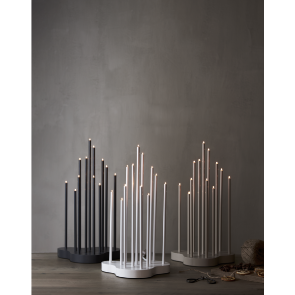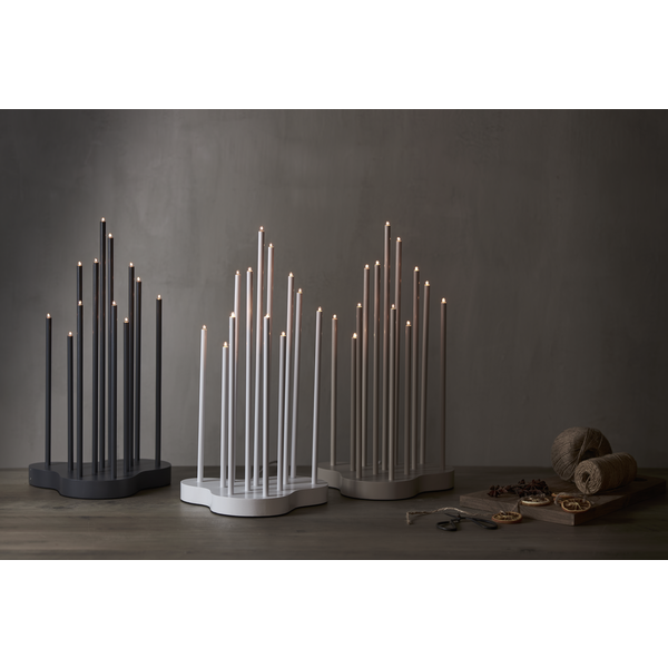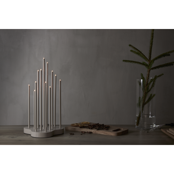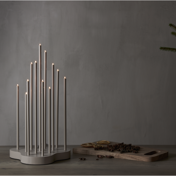 Beżowy świecznik o eleganckiej i harmonijnej formie to ozdoba, która subtelnie podkreśla świąteczny nastrój. Drewniana podstawa w beżowym kolorze stanowi stabilne tło dla smukłych metalowych rurek. Dwanaście świateł rozmieszczonych na różnych wysokościach otula wnętrze nastrojowym blaskiem, wprowadzając atmosferę spokoju i przytulności.