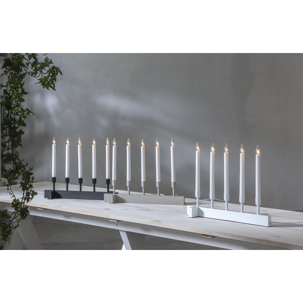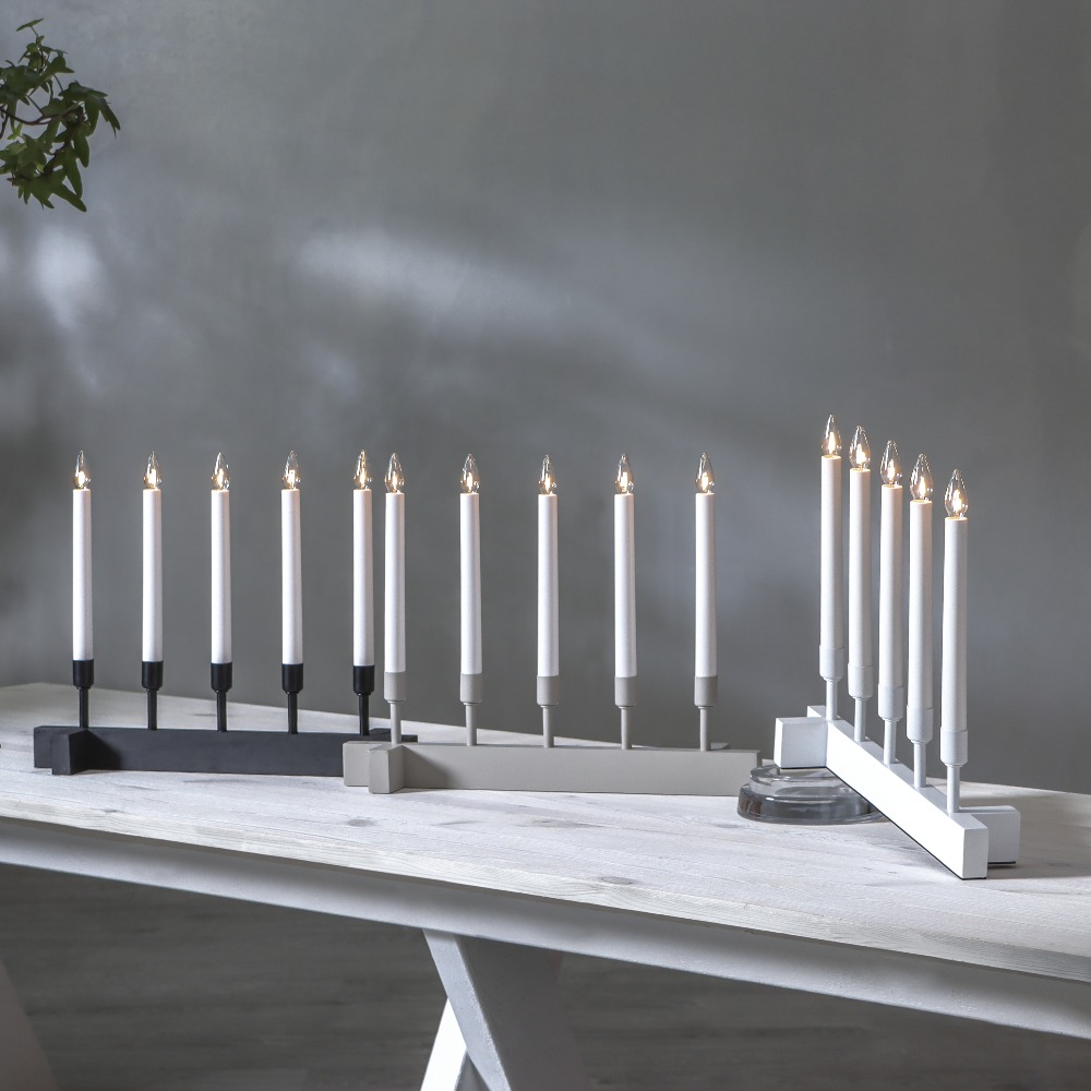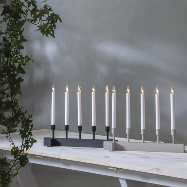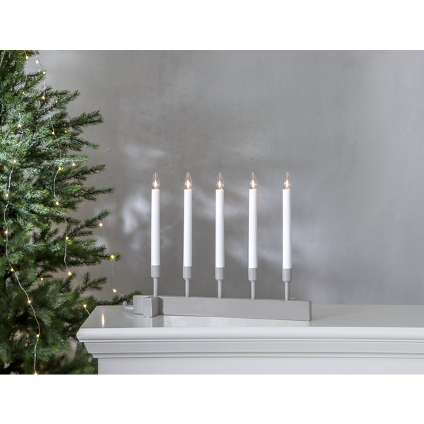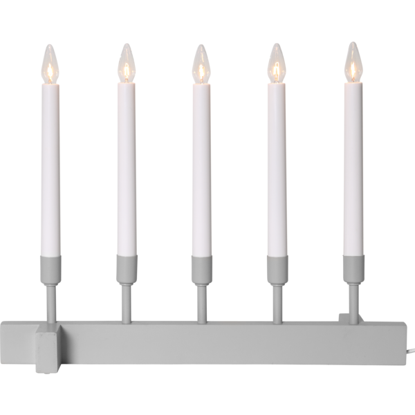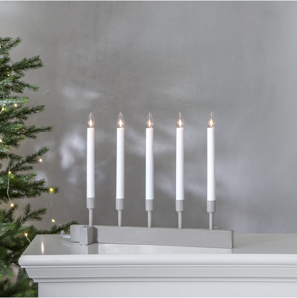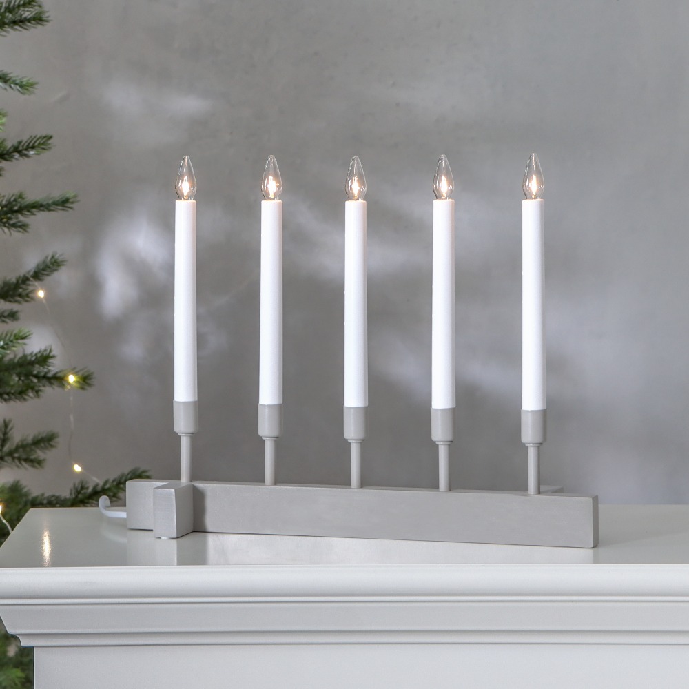 Beżowy świecznik o prostej, harmonijnej formie to dekoracja, która subtelnie ociepla wnętrze i wprowadza spokojny, świąteczny nastrój. Pięć smukłych świec osadzonych na jasnej, minimalistycznej podstawie tworzy wyważoną kompozycję, która pięknie prezentuje się zarówno w klasycznych, jak i nowoczesnych aranżacjach. Beżowe wykończenie dodaje całości naturalnego charakteru, a światło świec buduje przyjemną atmosferę na zimowe wieczory. Świecznik zasilany jest z sieci 230V i wyposażony w wymienne żarówki typu E10.