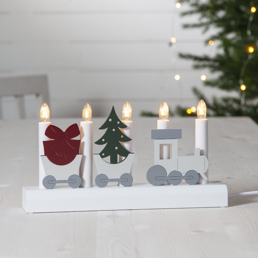 Świecznik w formie świątecznego pociągu to dekoracja, która wprowadza do wnętrza radosny i bajkowy nastrój. Wagoniki z choinką i prezentem oraz lokomotywa tworzą pełną uroku scenkę, idealnie oddającą świąteczną atmosferę. Pięć świeczek roztacza ciepłe światło, wypełniając dom przytulnością i magią zimowych wieczorów. Świecznik zasilany jest z sieci 230V, wyposażony w przełącznik na kablu i możliwość wymiany żarówek typu E10.