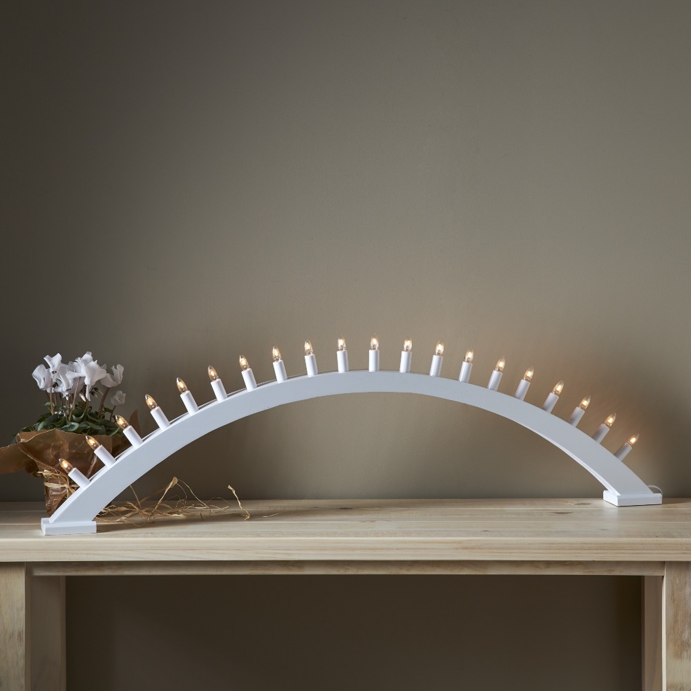 Biały świecznik w formie szerokiego łuku to wyjątkowa dekoracja, która pięknie podkreśla magię świąt. Liczne punkty świetlne rozmieszczone symetrycznie na całej jego długości tworzą efektowną iluminację, wypełniając wnętrze ciepłym i nastrojowym blaskiem. Smukła, elegancka forma sprawia, że świecznik doskonale prezentuje się zarówno w klasycznych, jak i nowoczesnych aranżacjach. Zasilany jest z sieci 230V, wyposażony w przełącznik na kablu oraz możliwość wymiany żarówek typu E10.