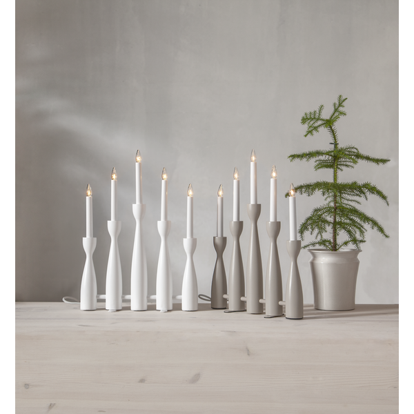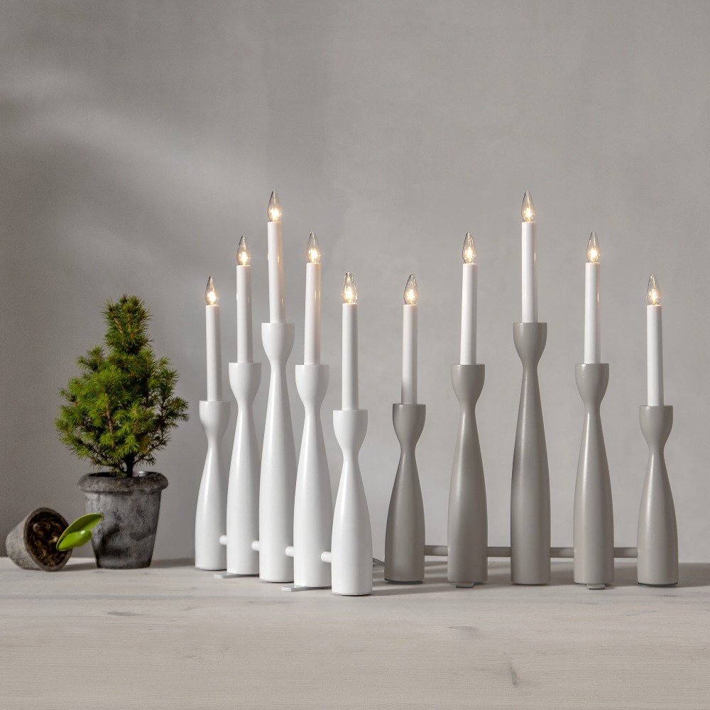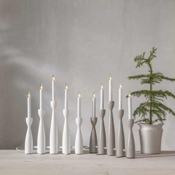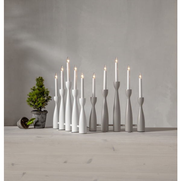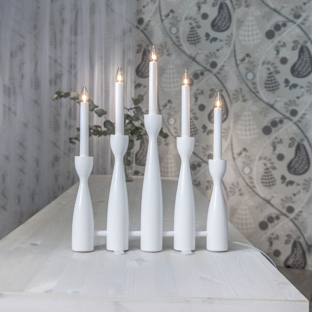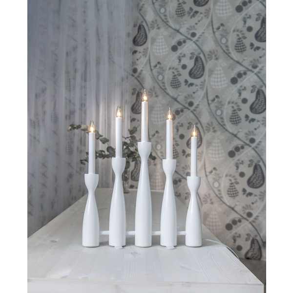 Biały świecznik o nowoczesnej formie to dekoracja, która łączy w sobie prostotę, elegancję i świąteczny nastrój. Pięć smukłych świec osadzonych na delikatnie profilowanych podstawach tworzy lekką, harmonijną kompozycję, która pięknie prezentuje się zarówno w klasycznych, jak i współczesnych wnętrzach. Wykonany z drewna i pomalowany na biało, świecznik wnosi do wnętrza naturalne ciepło i subtelną elegancję. Subtelne światło świec buduje atmosferę spokoju i wyciszenia. Zasilany jest z sieci 230V i posiada wymienne żarówki typu E10.