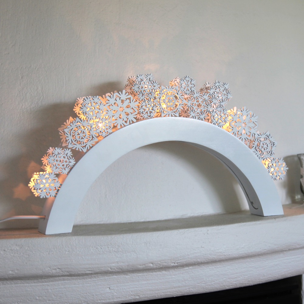 Biały świecznik w kształcie łuku ozdobiony delikatnymi płatkami śniegu to dekoracja, która wnosi do wnętrza zimową magię i świąteczny urok. Ciepłe światło ukryte pomiędzy śnieżnymi wzorami subtelnie rozjaśnia przestrzeń, tworząc atmosferę przytulności i spokoju. Ustawiony na parapecie, komodzie czy stole stanie się wyjątkowym akcentem zimowej aranżacji.