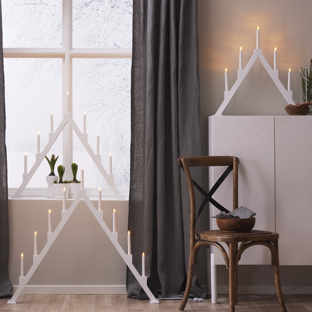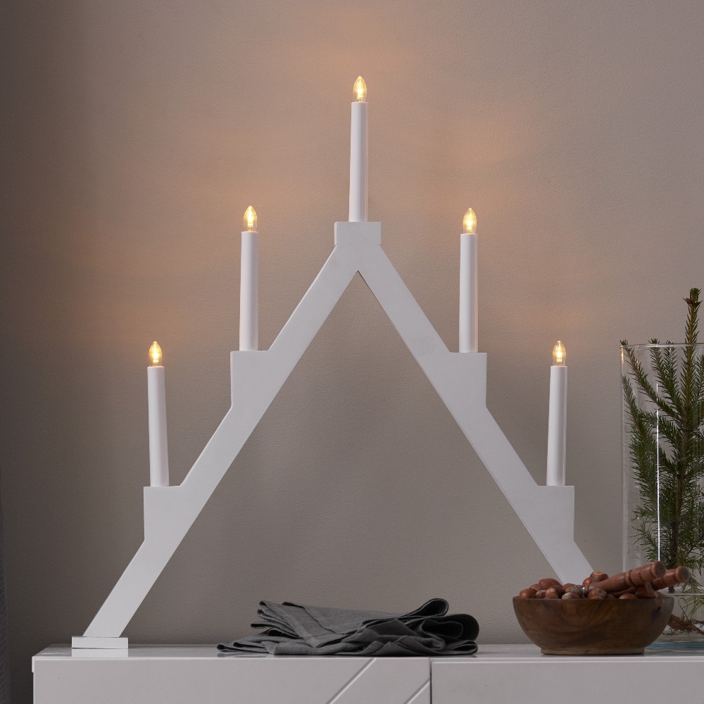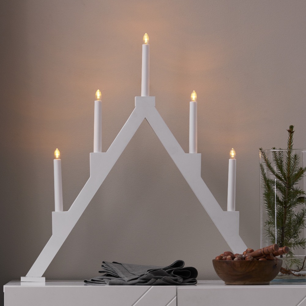 Biały drewniany świecznik to stylowa dekoracja, która łączy tradycję z nowoczesnym akcentem. Prosta, geometryczna forma w jasnej kolorystyce doskonale sprawdzi się zarówno w klasycznych, jak i współczesnych wnętrzach, wprowadzając do nich świąteczny blask. Pięć świeczek rozmieszczonych w symetrycznym układzie rozświetla przestrzeń ciepłym światłem, tworząc przytulną atmosferę zimowych wieczorów. Wykonany z drewna z certyfikatem FSC®, świecznik łączy estetykę z troską o środowisko. Dzięki zasilaniu 230V i wymiennym żarówkom E10 jest praktyczny i trwały.