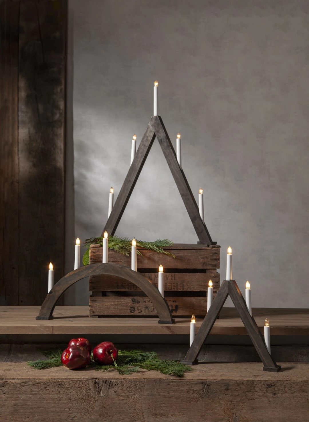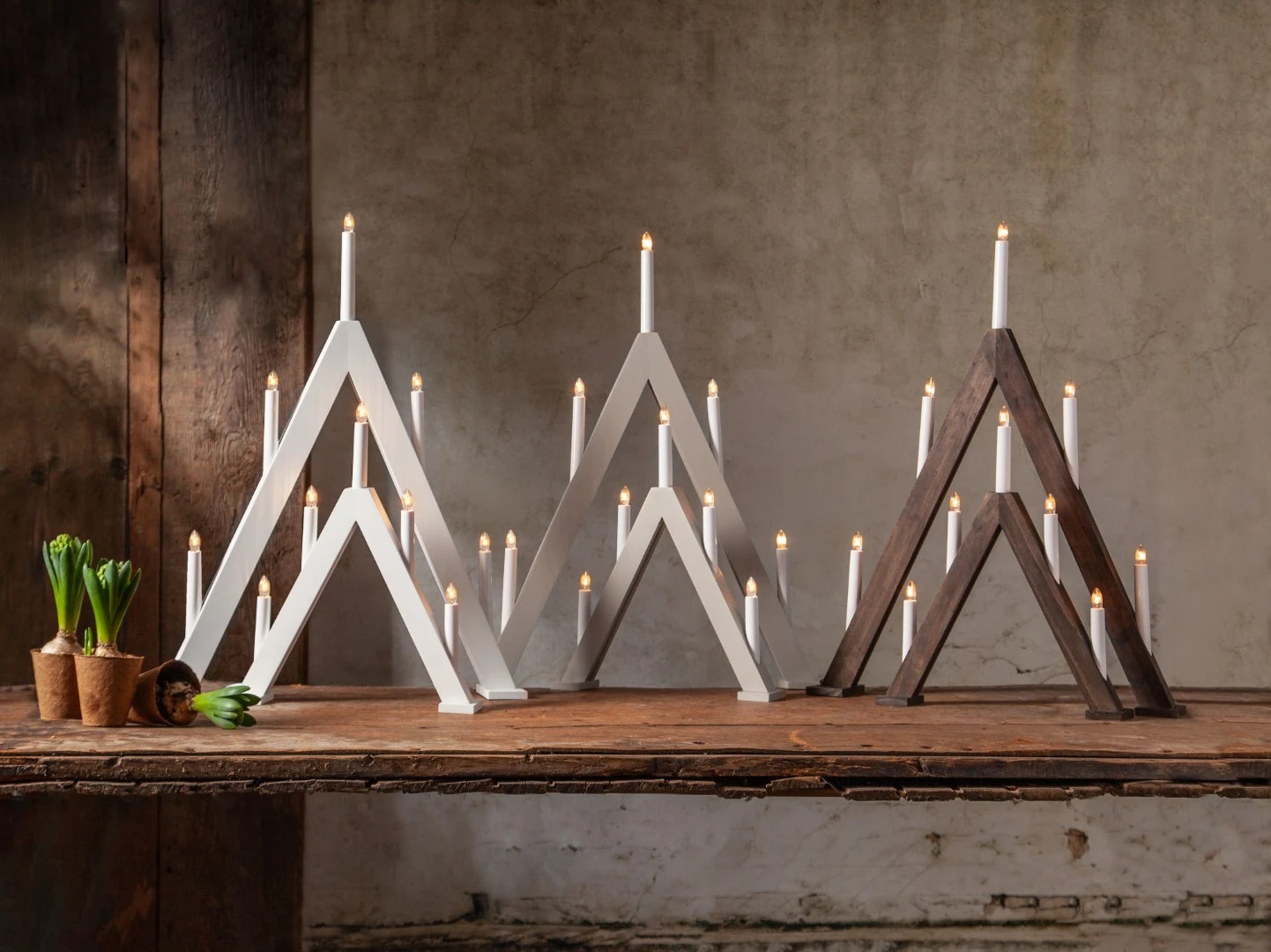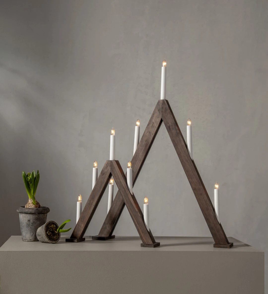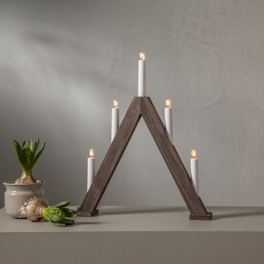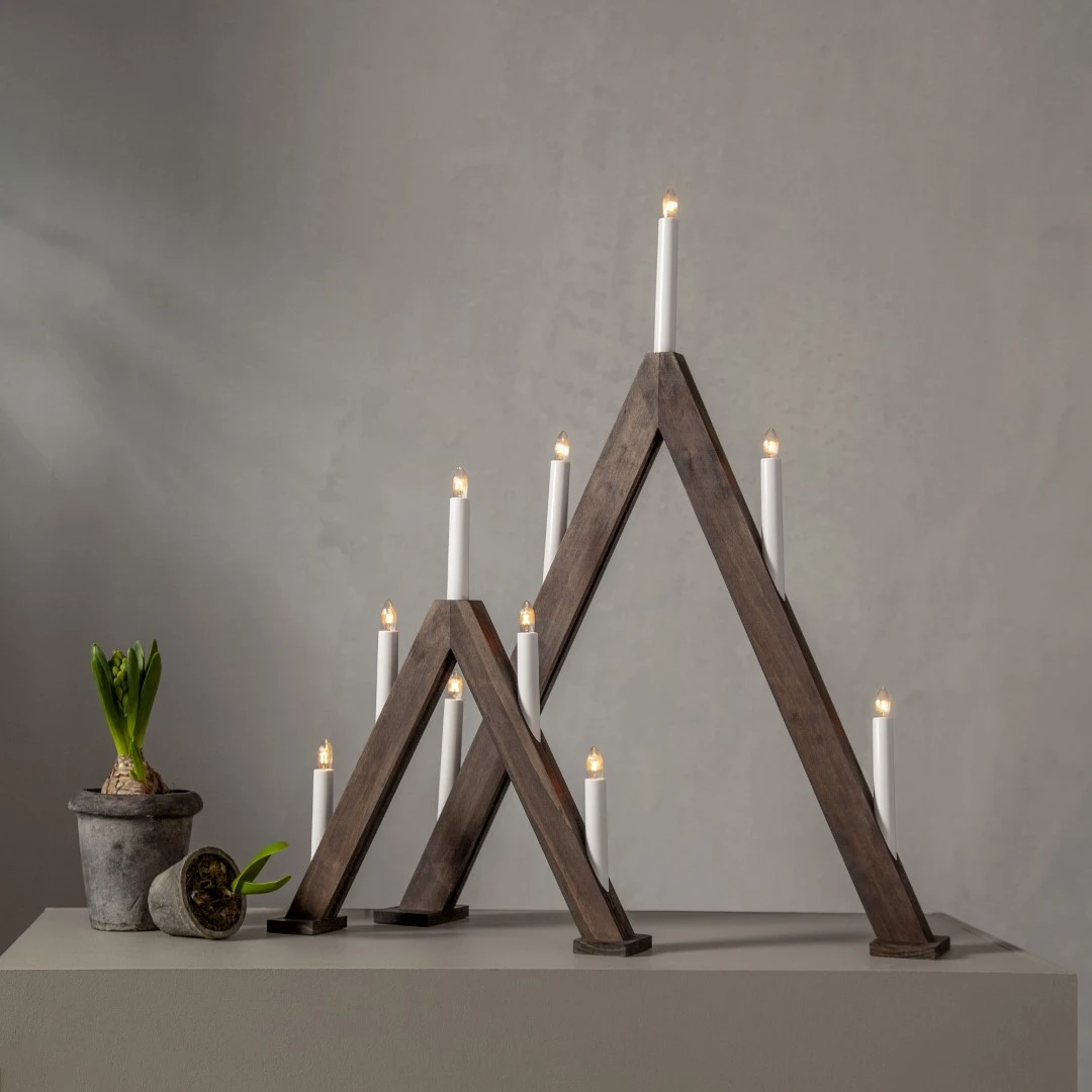Brązowy świecznik w kształcie trójkąta to elegancka dekoracja, która wnosi do wnętrza naturalne ciepło i świąteczny urok. Ciemny odcień drewna podkreśla jego klasyczny charakter, a jednocześnie sprawia, że świetnie komponuje się zarówno z nowoczesnymi, jak i tradycyjnymi aranżacjami. Umieszczony na parapecie, stole czy komodzie pięknie dopełnia świąteczny wystrój.