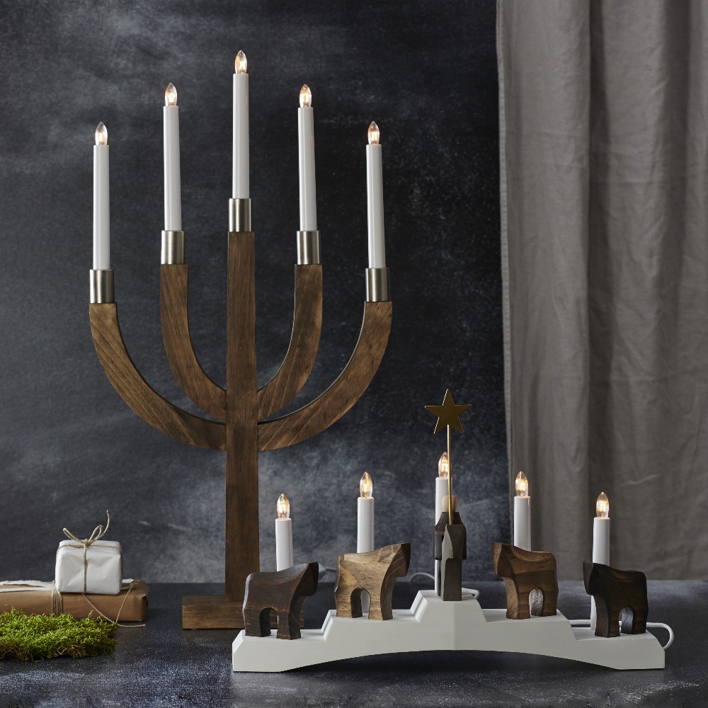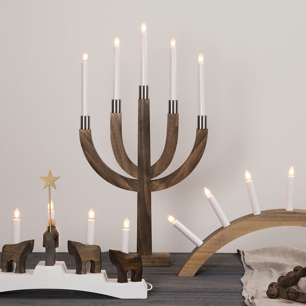 Brązowy świecznik to dekoracja, która wnosi do wnętrza naturalne ciepło i świąteczną elegancję. Ciepły odcień drewna w połączeniu ze srebrnymi detalami i białymi świecami tworzy harmonijną kompozycję, idealną na zimowe wieczory.