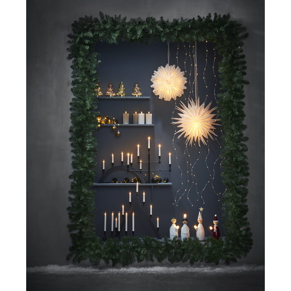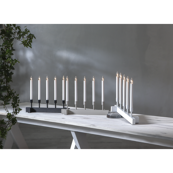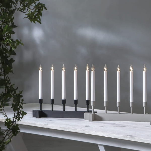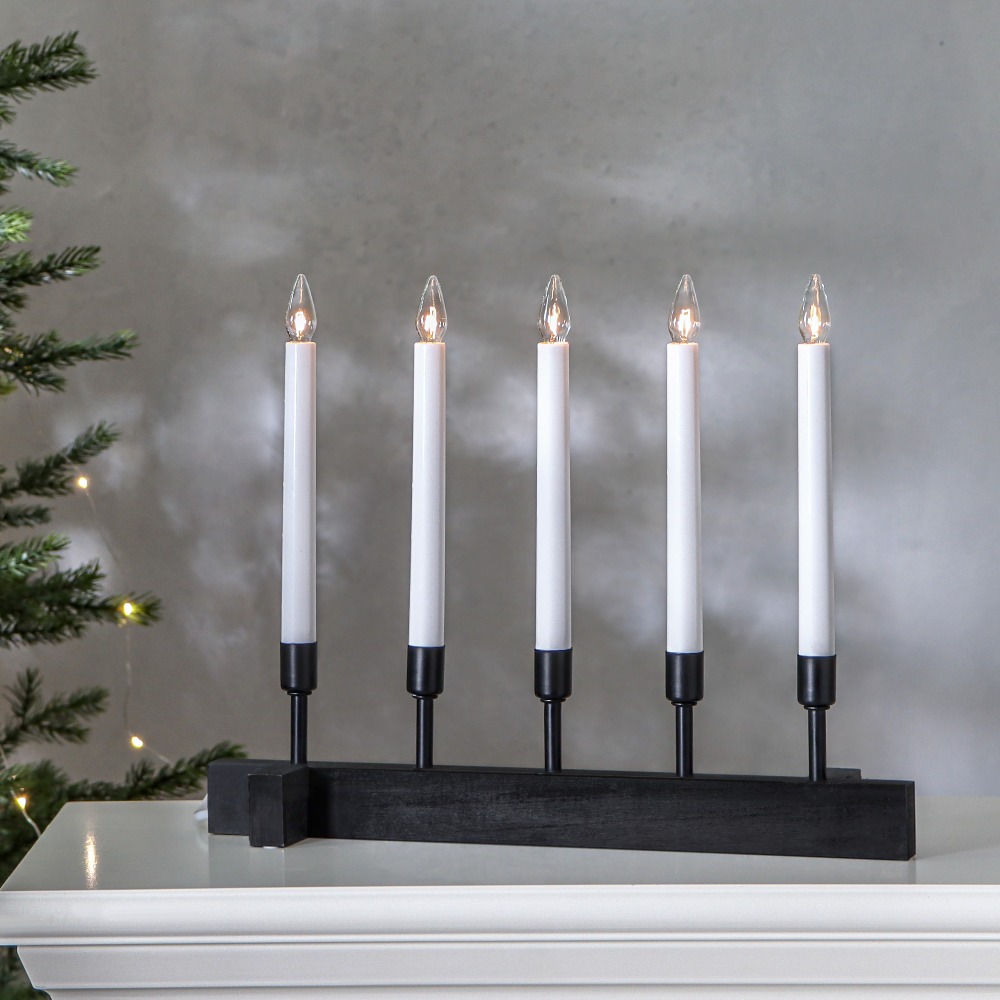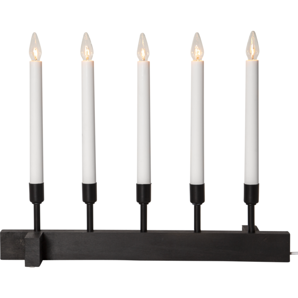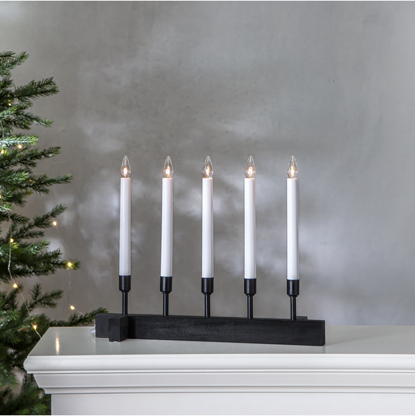 Czarny świecznik o prostej, eleganckiej formie to wyrazista dekoracja, która wnosi do wnętrza nutę nowoczesnej klasyki. Pięć smukłych świec osadzonych na ciemnej, minimalistycznej podstawie tworzy mocny, a jednocześnie stonowany akcent, doskonale komponujący się z jasnymi, drewnianymi lub industrialnymi wnętrzami. Subtelne światło żarówek łagodzi głębię koloru, budując nastrojowy klimat idealny na zimowe wieczory. Świecznik zasilany jest z sieci 230V i wyposażony w wymienne żarówki typu E10.
