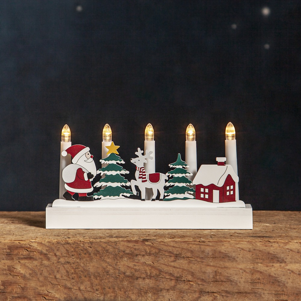 Świecznik w formie świątecznej scenerii to urocza dekoracja, która wprowadza do wnętrza magię Bożego Narodzenia. Mikołaj, renifer, choinki i domek tworzą przyjemną, bajkową kompozycję, a pięć świeczek roztacza ciepłe światło, budując atmosferę radości i rodzinnych chwil. Dzięki zasilaniu na baterie z timerem świecznik jest wygodny w użytkowaniu i idealny do ustawienia w dowolnym miejscu domu.