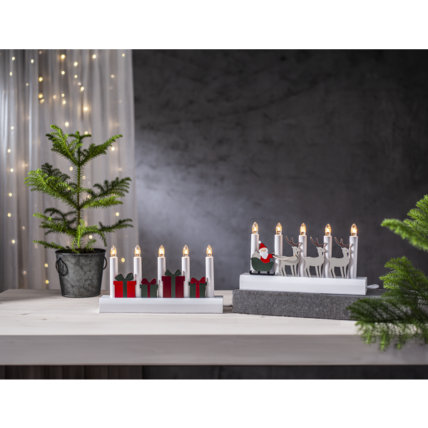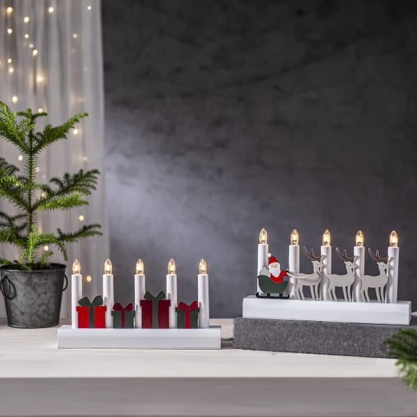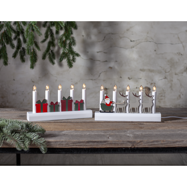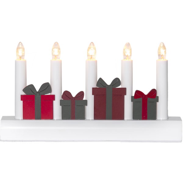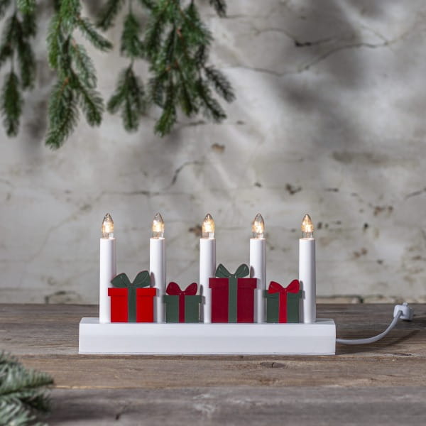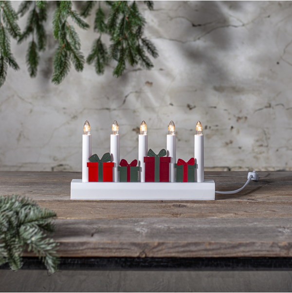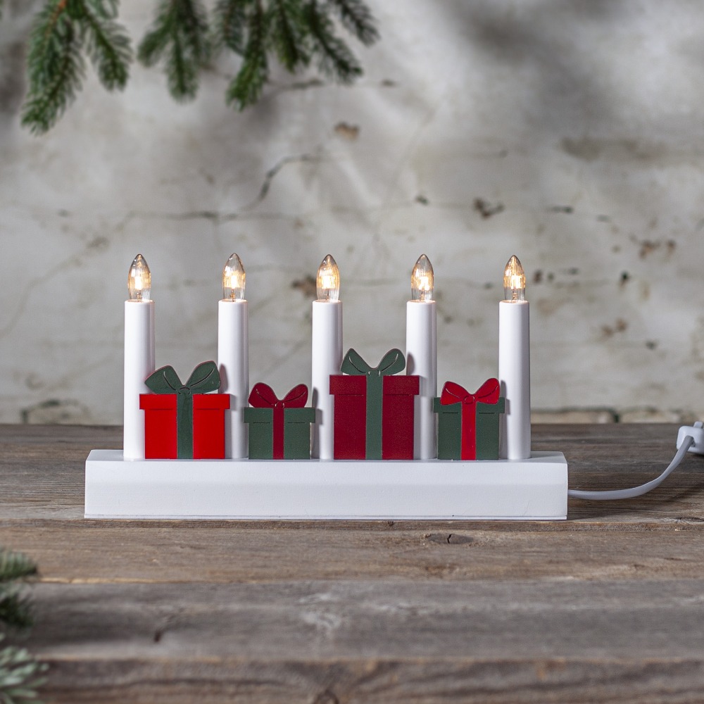 Świecznik z motywem prezentów to dekoracja, która wnosi do wnętrza radość i magię Bożego Narodzenia. Czerwone i zielone upominki ułożone pomiędzy świeczkami tworzą radosną, a jednocześnie elegancką kompozycję, doskonale podkreślającą świąteczny nastrój. Pięć świeczek roztacza ciepłe światło, które wypełnia dom przytulną atmosferą zimowych wieczorów. Produkt posiada certyfikat FSC®, co potwierdza, że drewno wykorzystane do jego wykonania pochodzi z odpowiedzialnych źródeł. Świecznik zasilany jest z sieci 230V, wyposażony w przełącznik na kablu oraz wymienne żarówki typu E10, co zapewnia wygodę i długie użytkowanie.