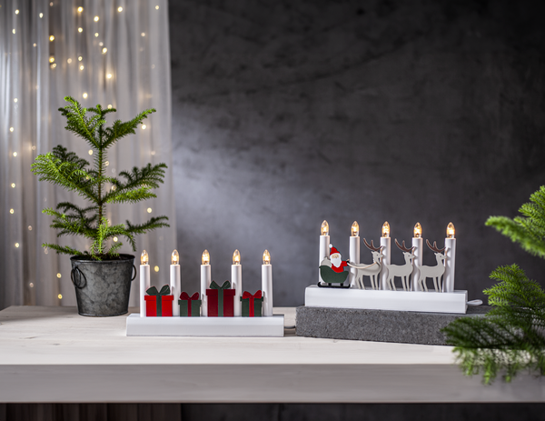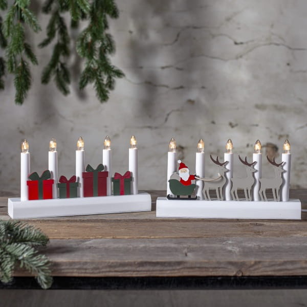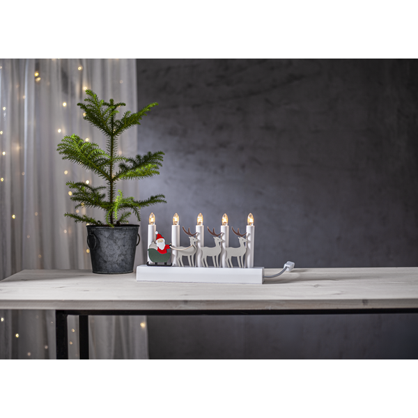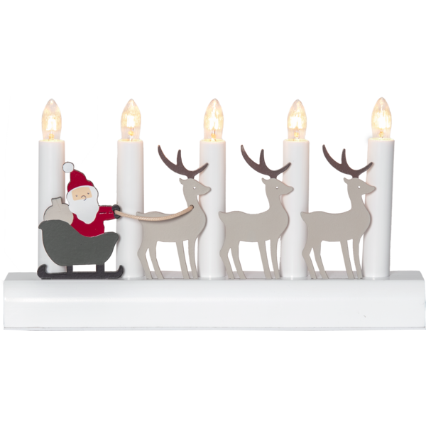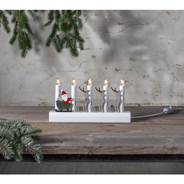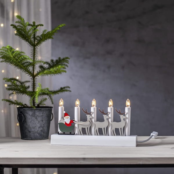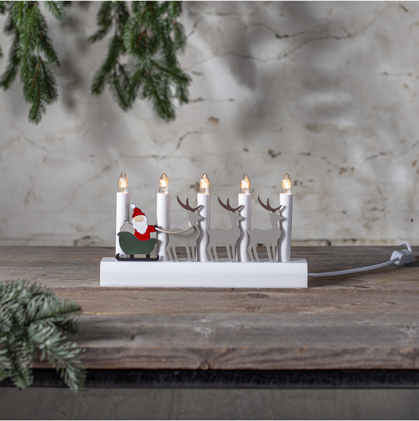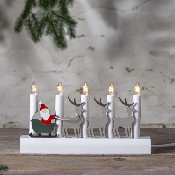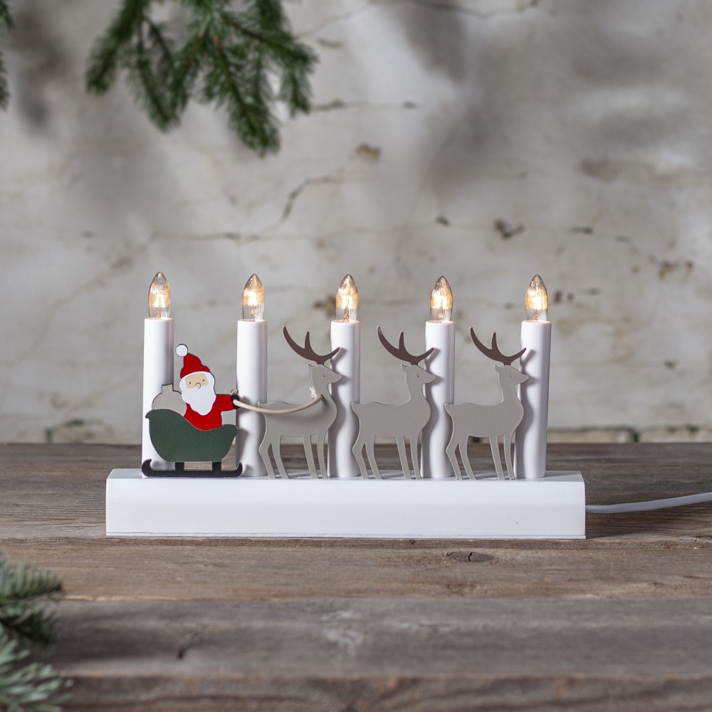 Świecznik z motywem Mikołaja w saniach ciągniętych przez renifery to wyjątkowa dekoracja, która od razu przywołuje magię Bożego Narodzenia. Figury umieszczone pomiędzy świeczkami tworzą bajkową scenkę, pełną radości i świątecznego klimatu. Pięć świeczek roztacza ciepłe światło, rozświetlając wnętrze i budując atmosferę bliskości podczas zimowych wieczorów. Produkt wykonany z drewna posiada certyfikat FSC®, co oznacza, że powstał z poszanowaniem środowiska. Świecznik zasilany jest z sieci 230V, wyposażony w przełącznik na kablu oraz wymienne żarówki typu E10, co gwarantuje wygodę i trwałość użytkowania.
