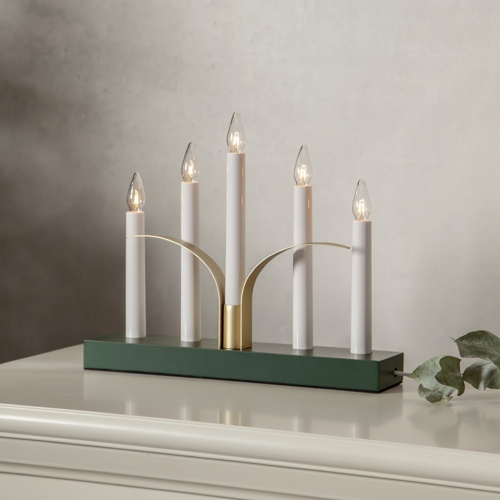 Zielony drewniany świecznik o eleganckim, nowoczesnym kształcie to dekoracja, która subtelnie nawiązuje do tradycji, zachowując współczesny charakter. Pięć smukłych świec ustawionych na ciemnozielonej podstawie zdobią delikatne złote łuki, które dodają lekkości i wyrafinowania. Połączenie bieli, złota i głębokiej zieleni wprowadza do wnętrza spokój, świeżość i odrobinę świątecznej elegancji. Świecznik zasilany jest z sieci 230V, a żarówki typu E10 można łatwo wymieniać.