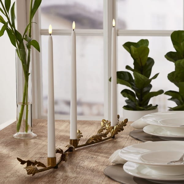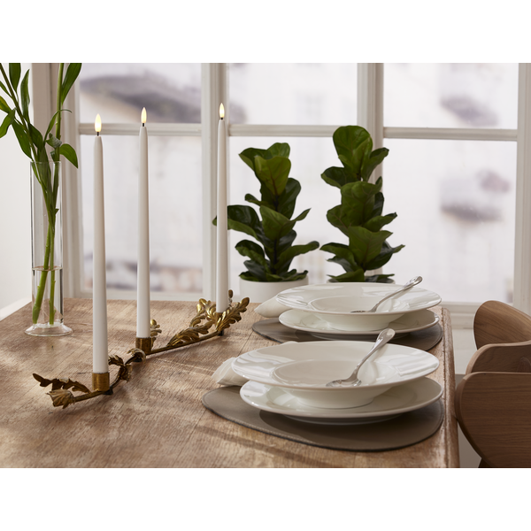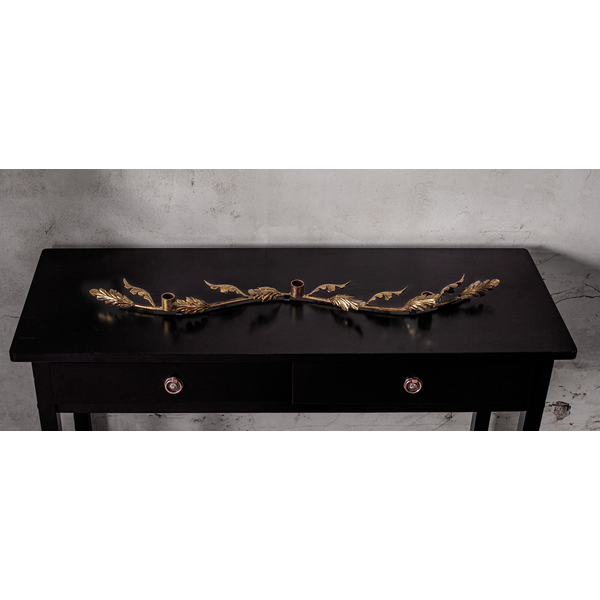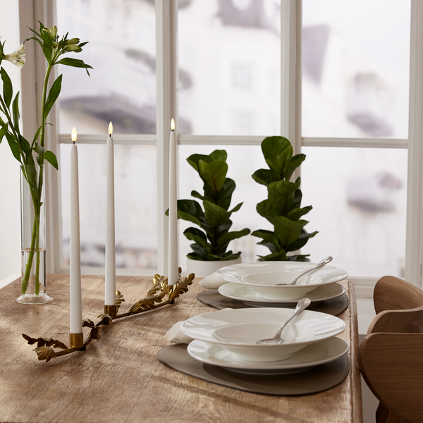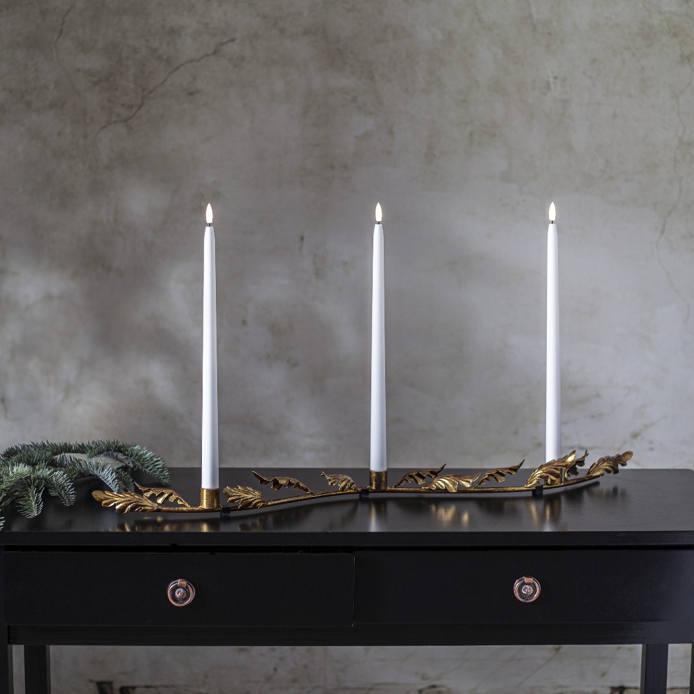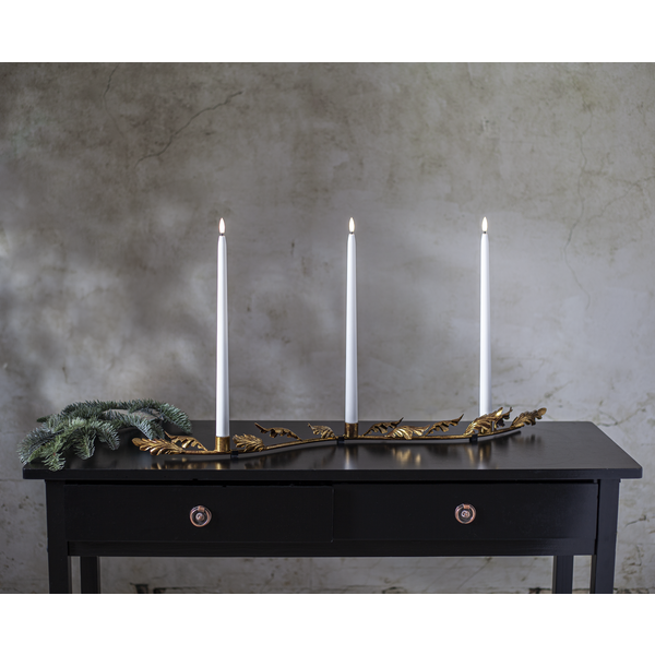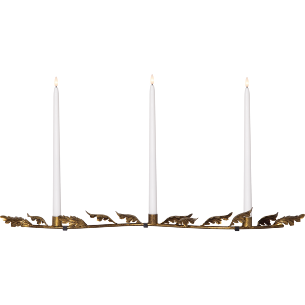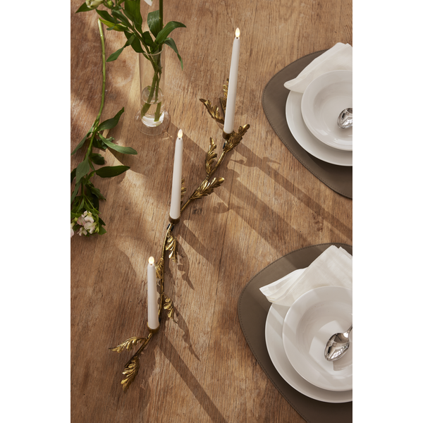 Projekt autorstwa Charlotte Falck, który zachwyca subtelną elegancją i dbałością o detale. Metalowa konstrukcja w kolorze antycznego mosiądzu została ozdobiona dekoracyjnym motywem liści, nadając całości wyjątkowego charakteru. To ponadczasowa ozdoba, która pięknie prezentuje się na stole, komodzie czy parapecie, wprowadzając do wnętrza ciepłą i nastrojową atmosferę. Klasyczna forma sprawia, że świecznik będzie zachwycał swoim urokiem przez wiele lat. Produkt sprzedawany jest bez oświetlenia – dla pełnego efektu zaleca się zastosowanie świec LED na baterie.
