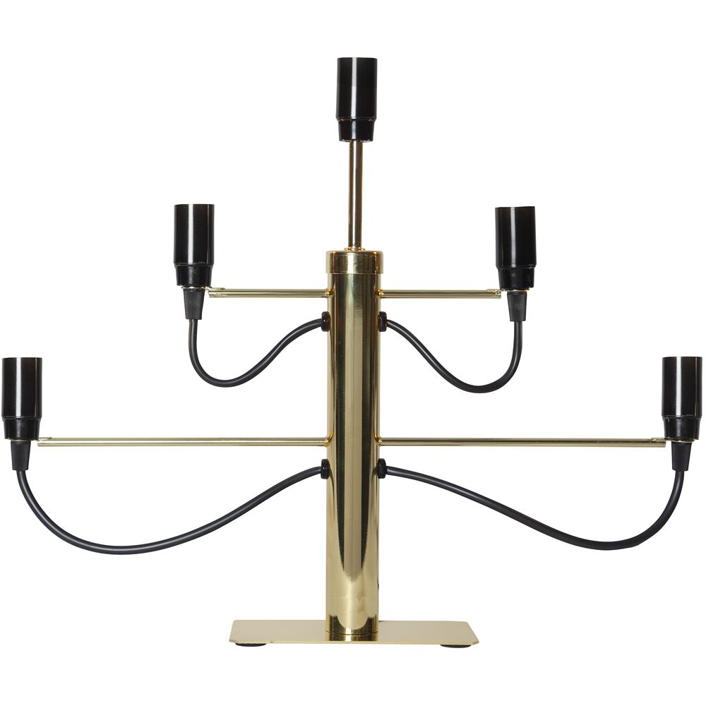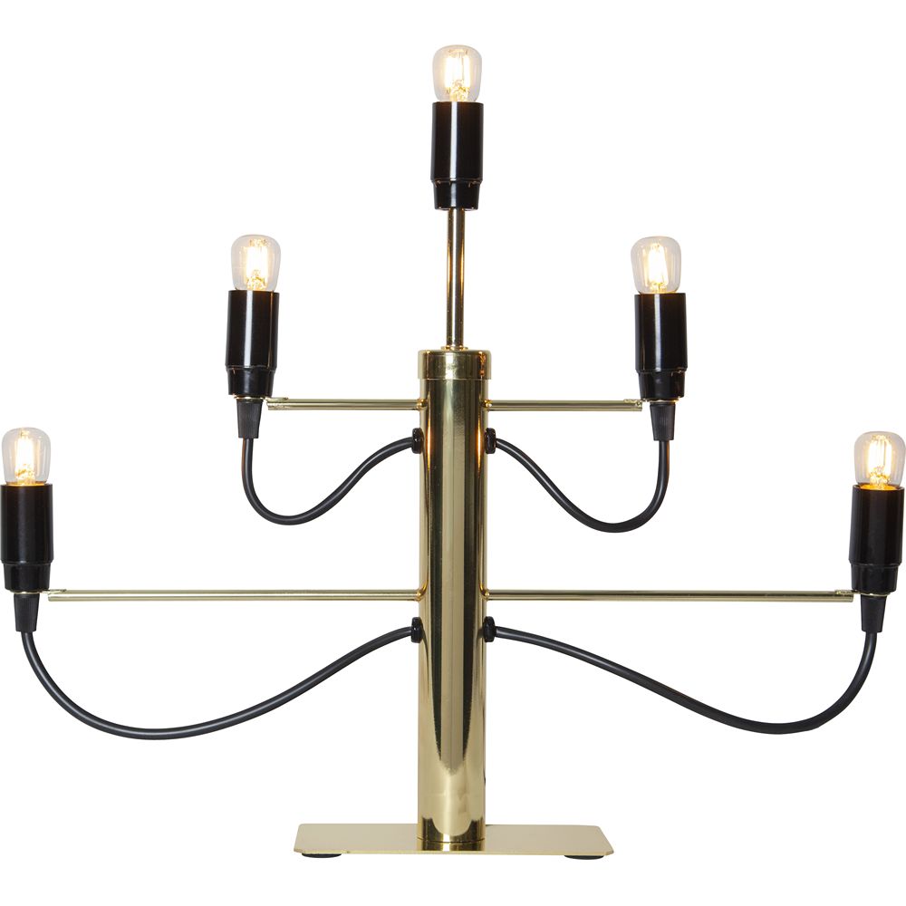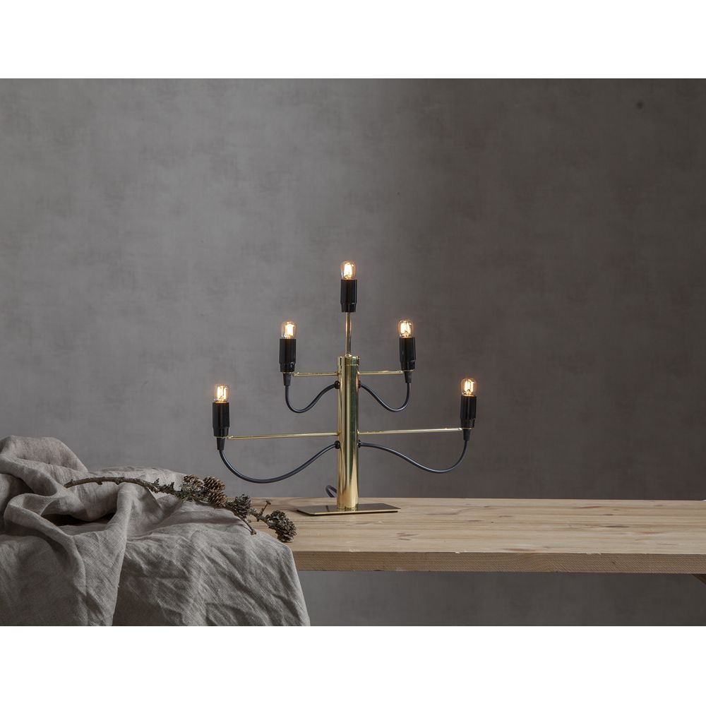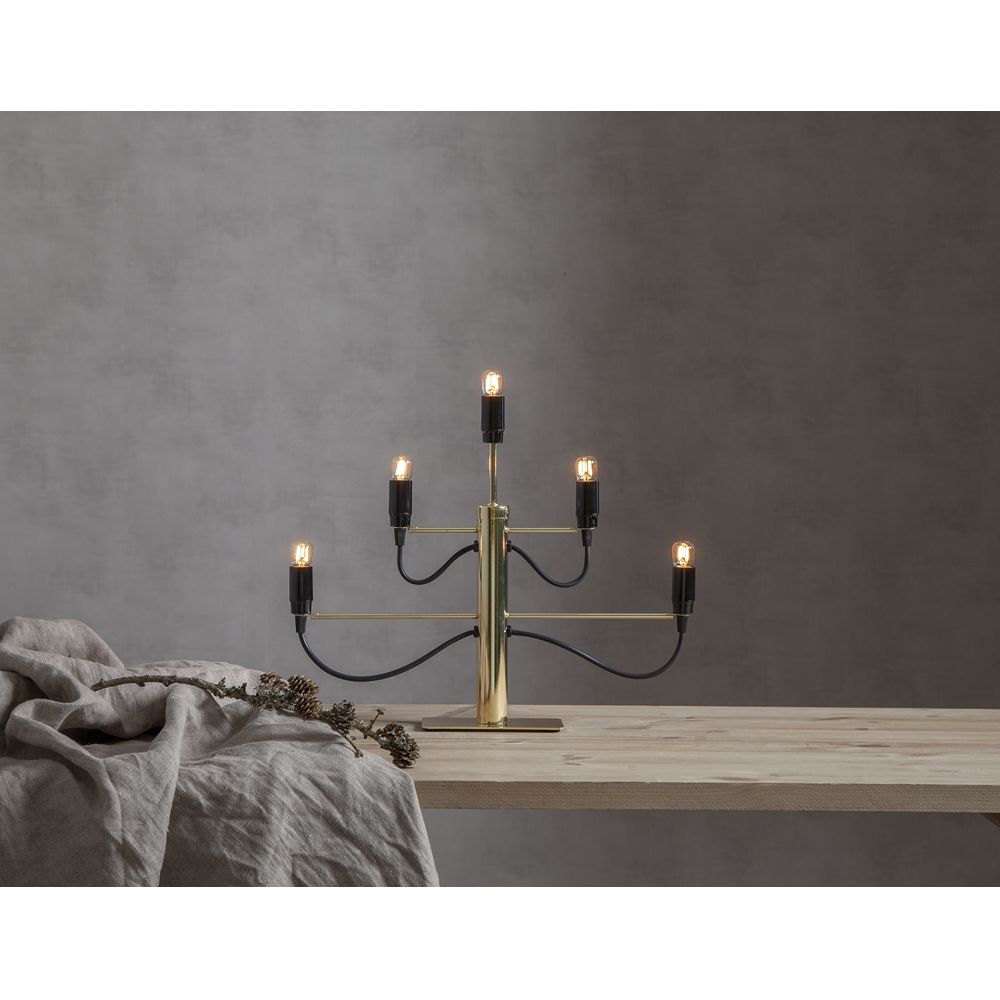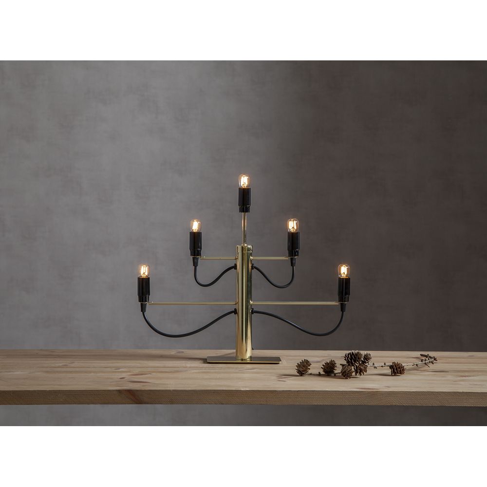 Świecznik elektryczny w kolorze mosiężnym z pięcioma ramionami i czarnymi oprawkami na żarówki, widok produktowy na białym tle.