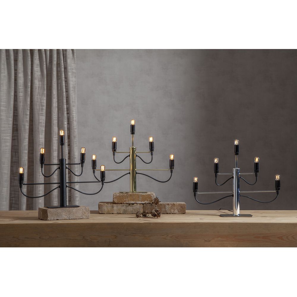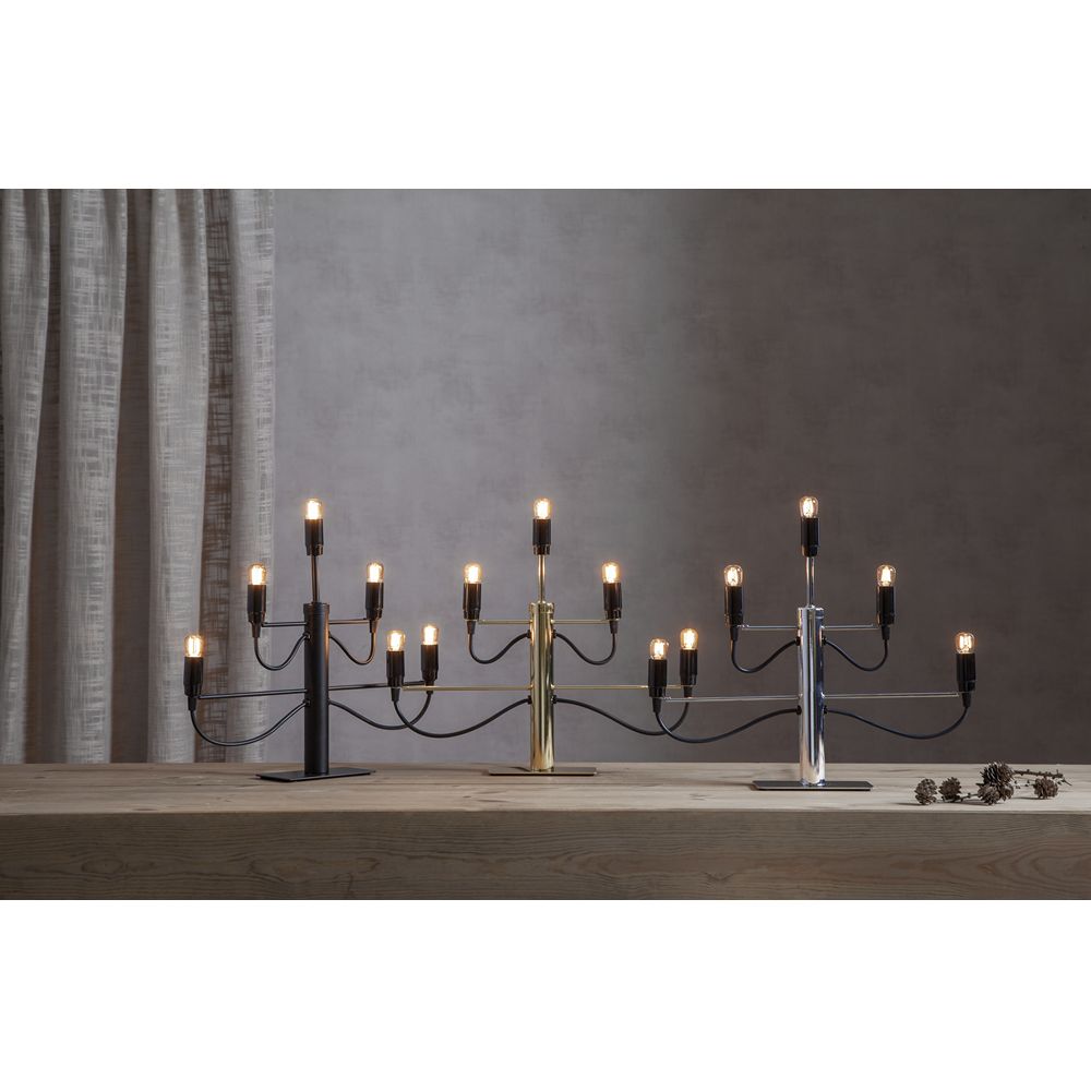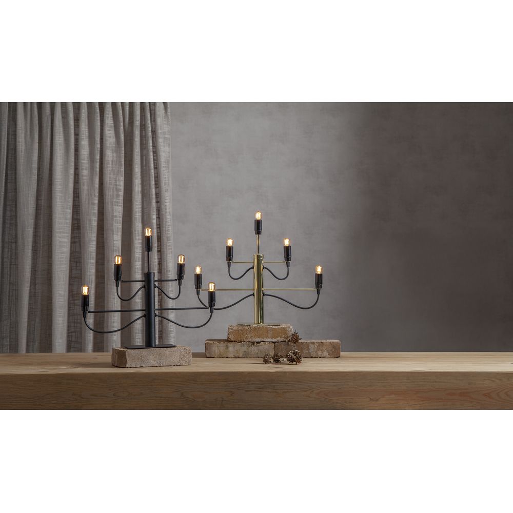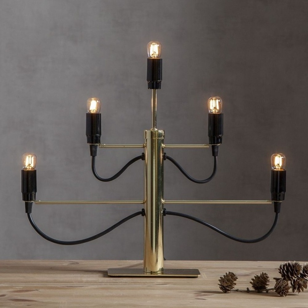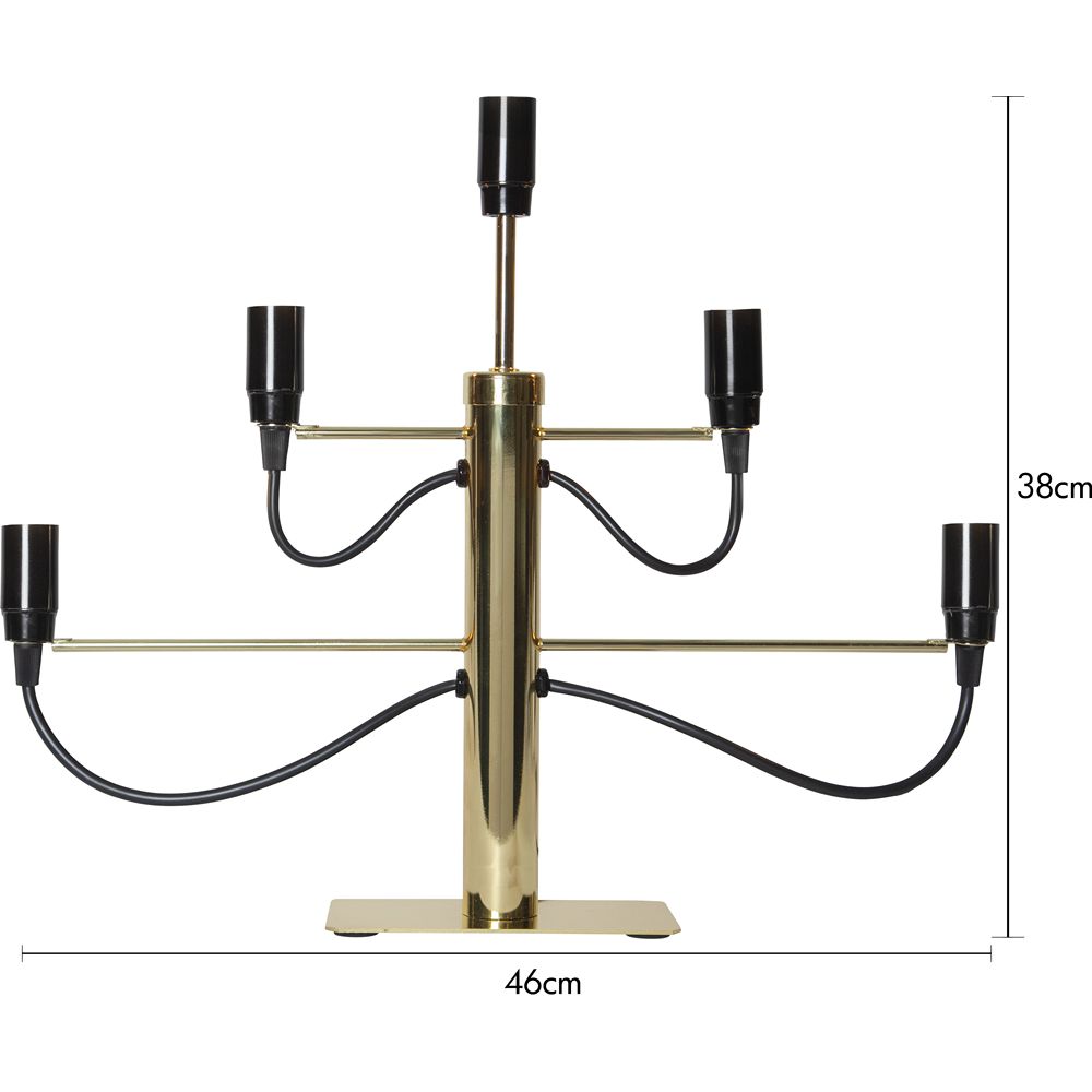 Świecznik elektryczny w kolorze mosiężnym z pięcioma ramionami i czarnymi oprawkami na żarówki, widok produktowy na białym tle.