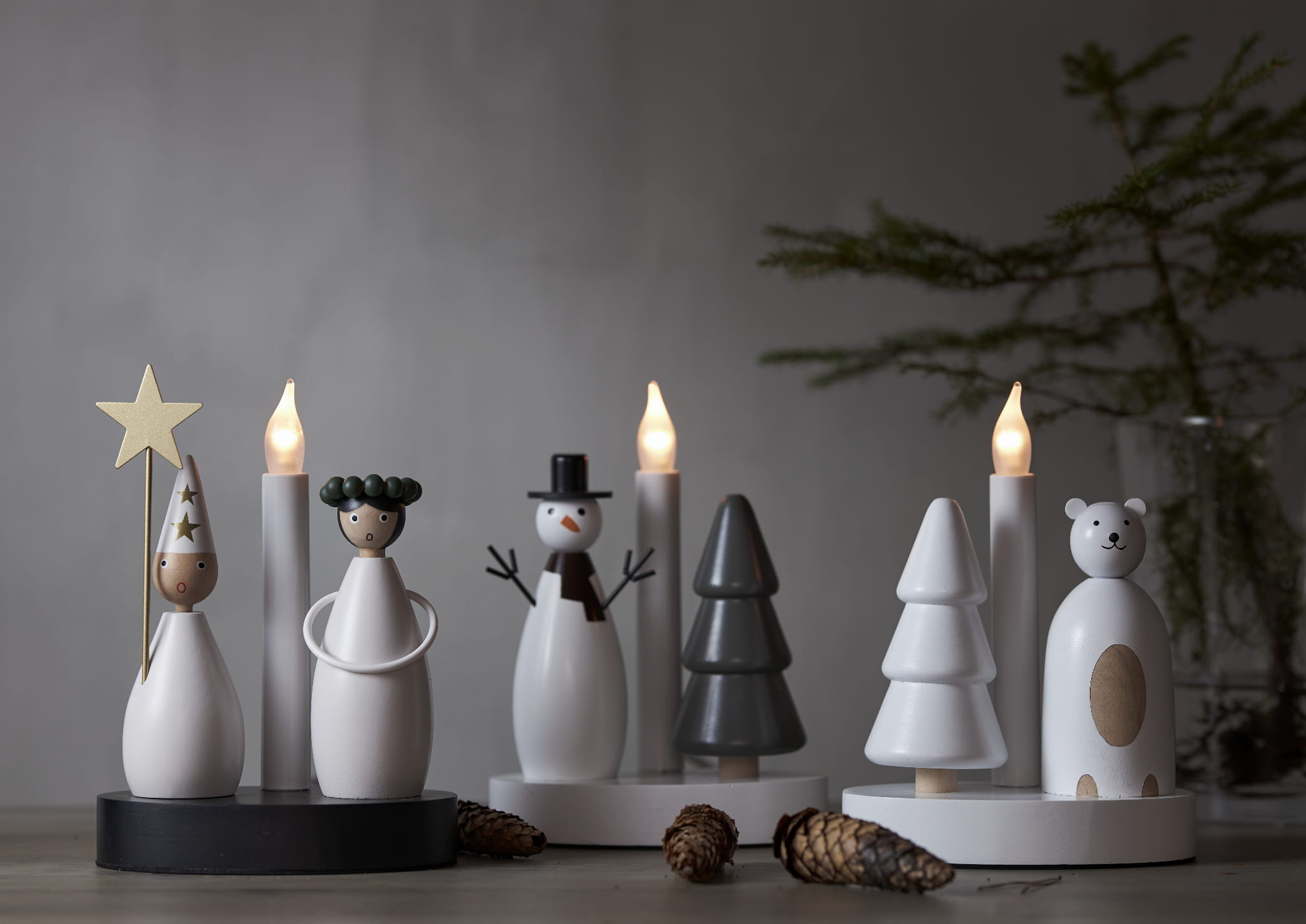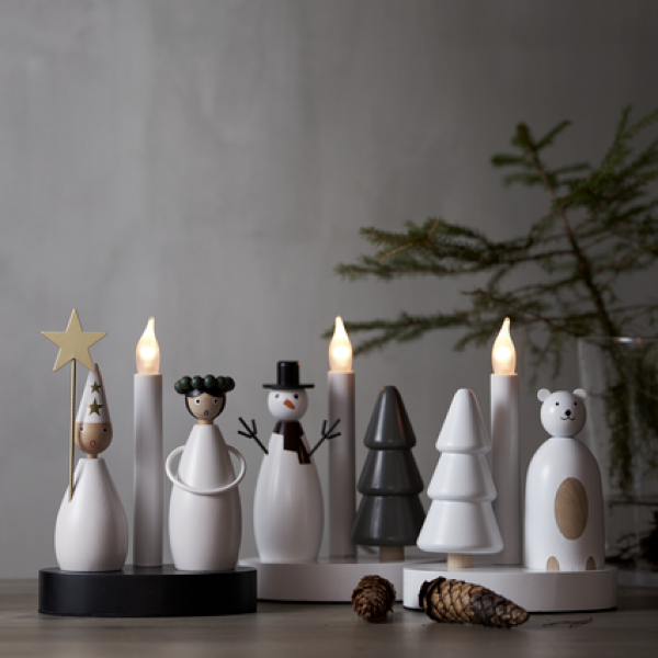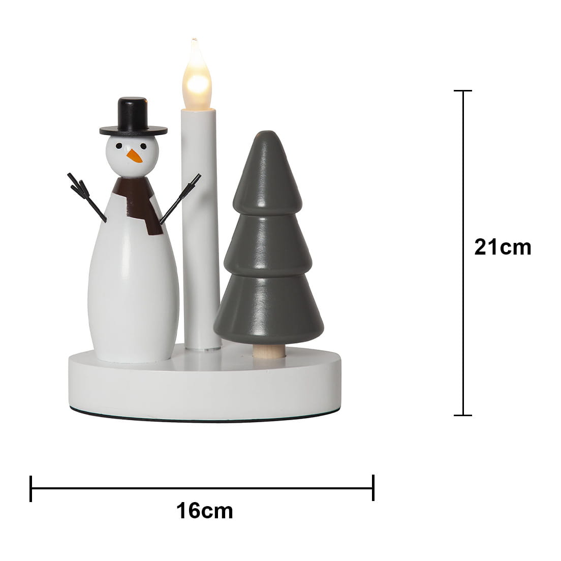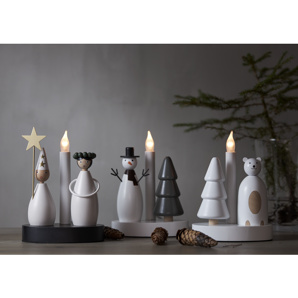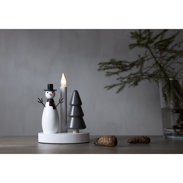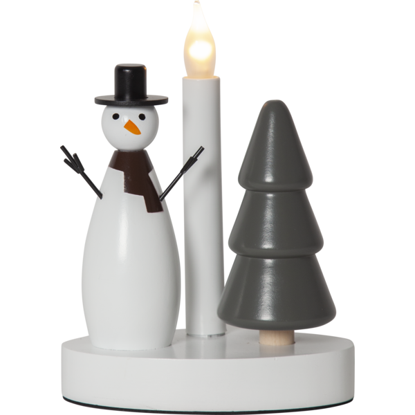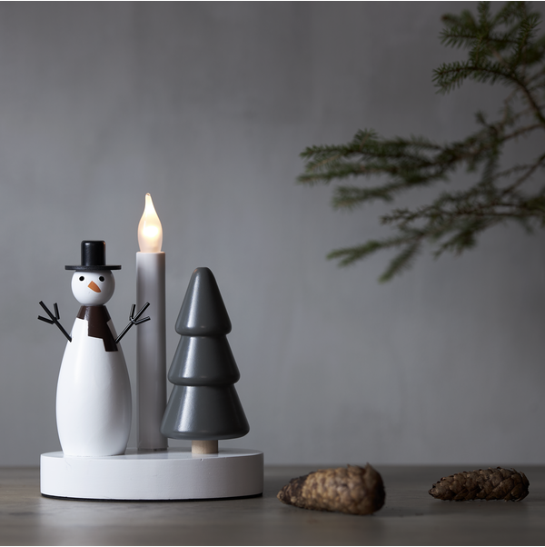 Radosny motyw zimowy – połączenie klasycznej figurki bałwanka i drewnianej choinki ze świecą LED przywołuje atmosferę świątecznych wieczorów i zimowych krajobrazów.