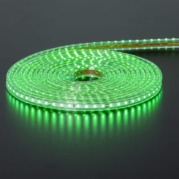 Zielona taśma LED zwinięta w spiralę, emitująca intensywne światło na ciemnym podłożu, z wyraźnym odbiciem poświaty.