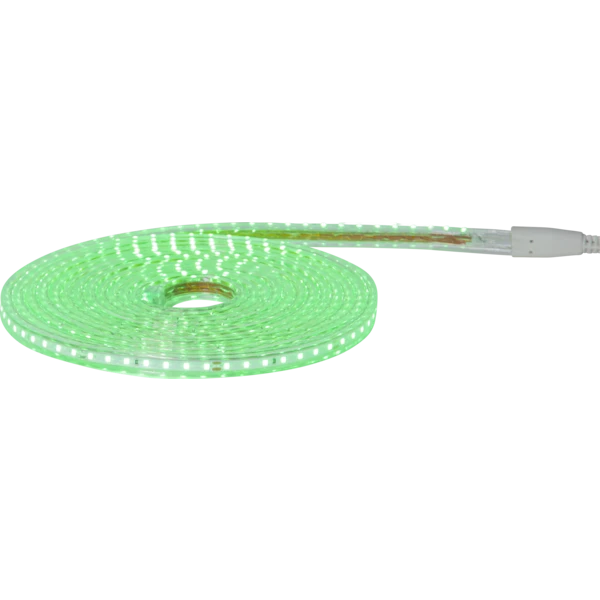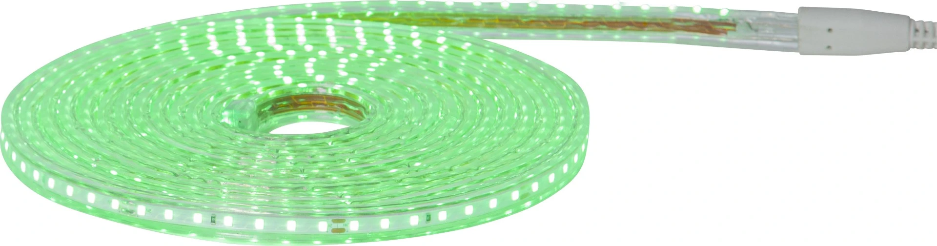 Elastyczna taśma LED w kolorze zielonym, zwinięta w krąg, z gęstym rozmieszczeniem diod, zakończona białą wtyczką zasilającą.