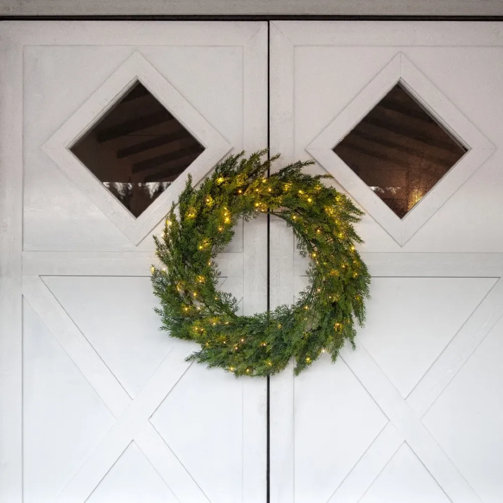 Imponujący wianek o średnicy 80 cm, wykonany z realistycznie wyglądających gałązek tui z materiału PE, to elegancka dekoracja świąteczna, która przyciąga uwagę swoją formą i światłem. Doskonale sprawdzi się zarówno wewnątrz, jak i na zewnątrz – na drzwiach, w ogrodzie lub jako ozdoba elewacji. Dzięki zasilaniu sieciowemu i subtelnemu oświetleniu LED, wprowadza przytulny i magiczny nastrój w każdej przestrzeni.