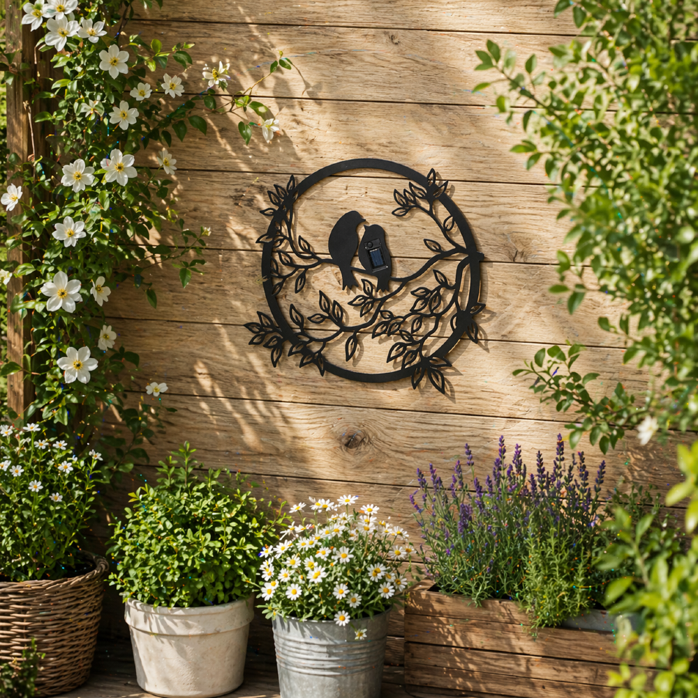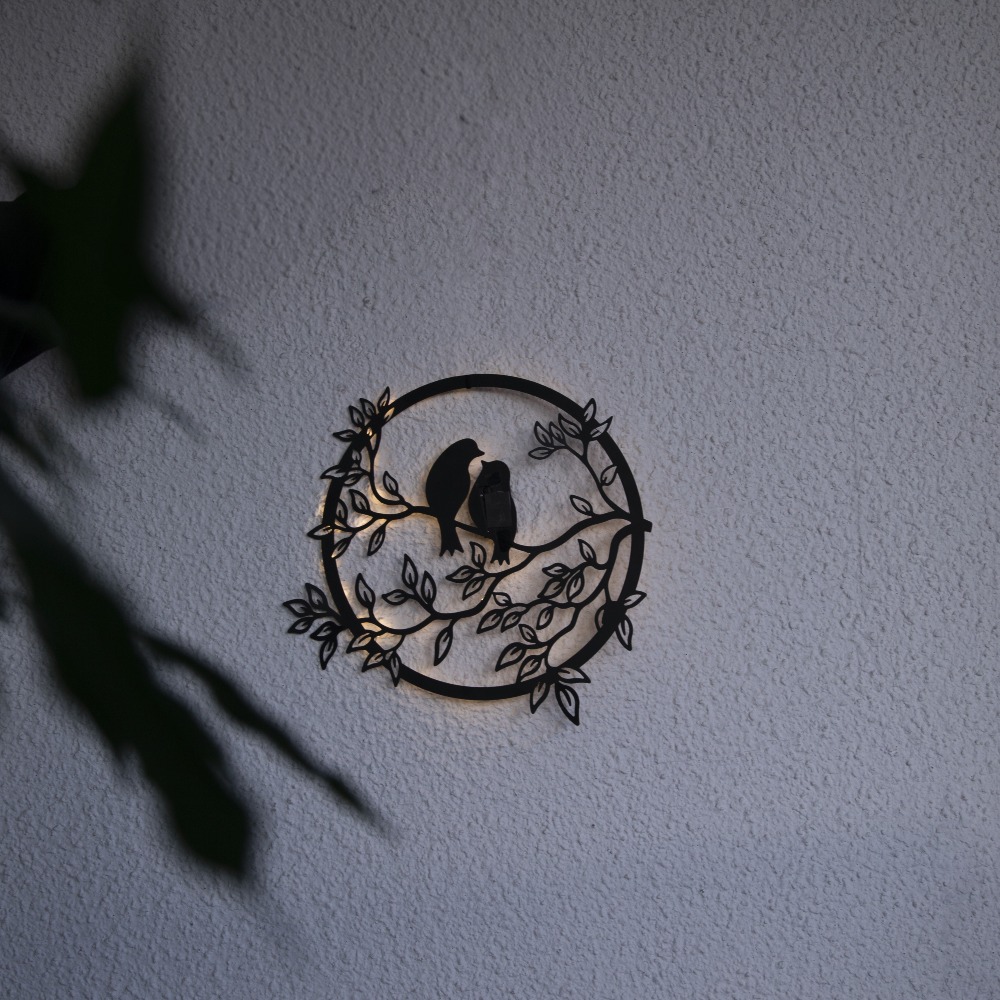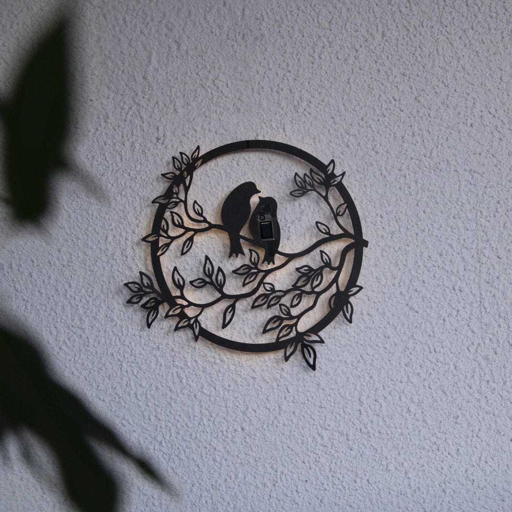 Solarna dekoracja z wyciętym motywem dwóch ptaków na gałęzi w okrągłej formie, wykonana w minimalistycznym stylu. Delikatne podświetlenie LED podkreśla wzór po zmroku, dodając przestrzeni nastrojowego charakteru.