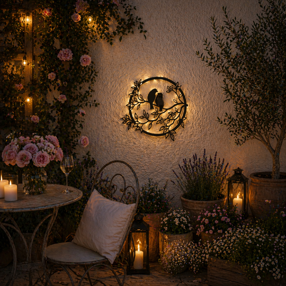 Czarna dekoracja solarna z motywem ptaków podświetlona ciepłym światłem na jasnej ścianie. Wokół widoczne kwiaty w donicach, lampiony i stolik z krzesłem, tworzące nastrojową, wieczorną aranżację ogrodu.