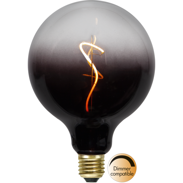Żarówka LED E27 typu globe z przydymionym szkłem i spiralnym filamentem, czarny gradient, oznaczenie dimmer compatible, ujęcie produktowe na białym tle.