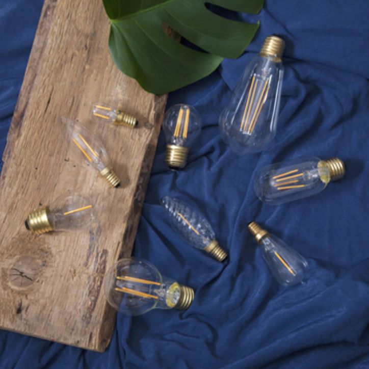 Żarówka LED E14 mini globe z ciepłym światłem, przezroczysta bańka i złoty gwint, pojedynczy filament w stylu vintage.